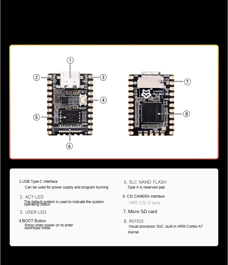 LuckFox Pico MINI es una placa de microdesarrollo Linux rentable, basada en el chip Rockchip RV1103 para proporcionar una plataforma de desarrollo simple y eficiente para los desarrolladores;Admite una variedad de interfaces que incluyen MIPI CSI, GPIO, UART, SPI, I2C, USB, etc., lo cual es conveniente para desarrollar y depurar rápidamente.