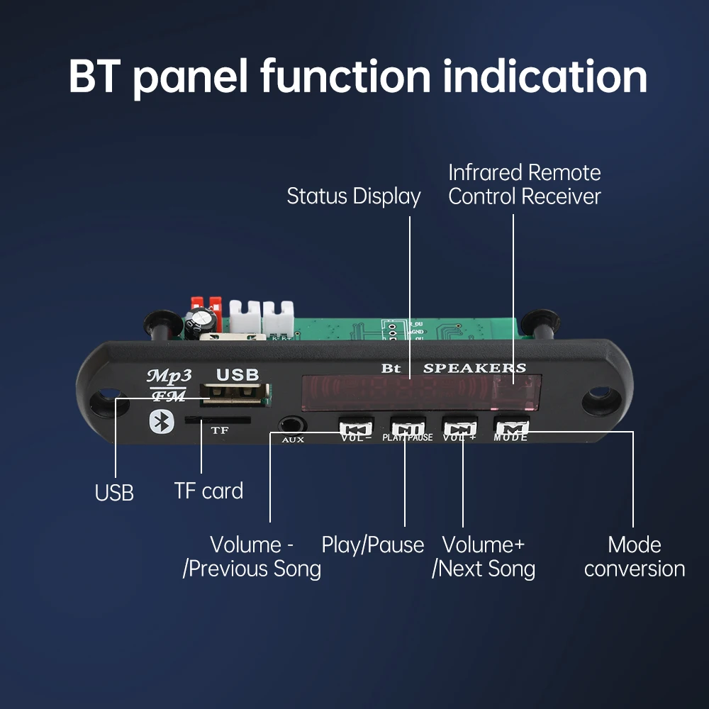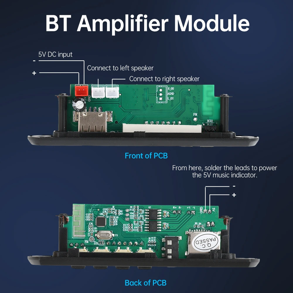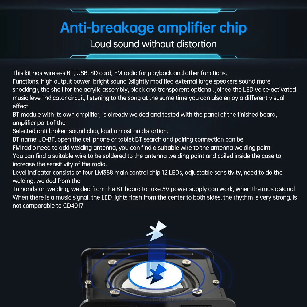 Nombre de Bluetooth: JQ-BT, puede abrir el teléfono celular o la tableta La búsqueda y la conexión de emparejamiento de Bluetooth.La radio FM necesita agregar una antena de soldadura, puede encontrar un cable adecuado soldado al punto de soldadura de la antena y un disco en el chasis para aumentar la sensibilidad de la radio.