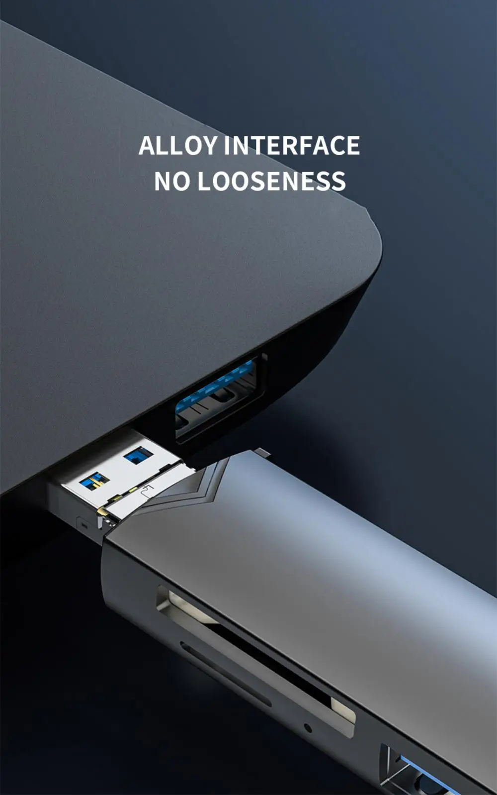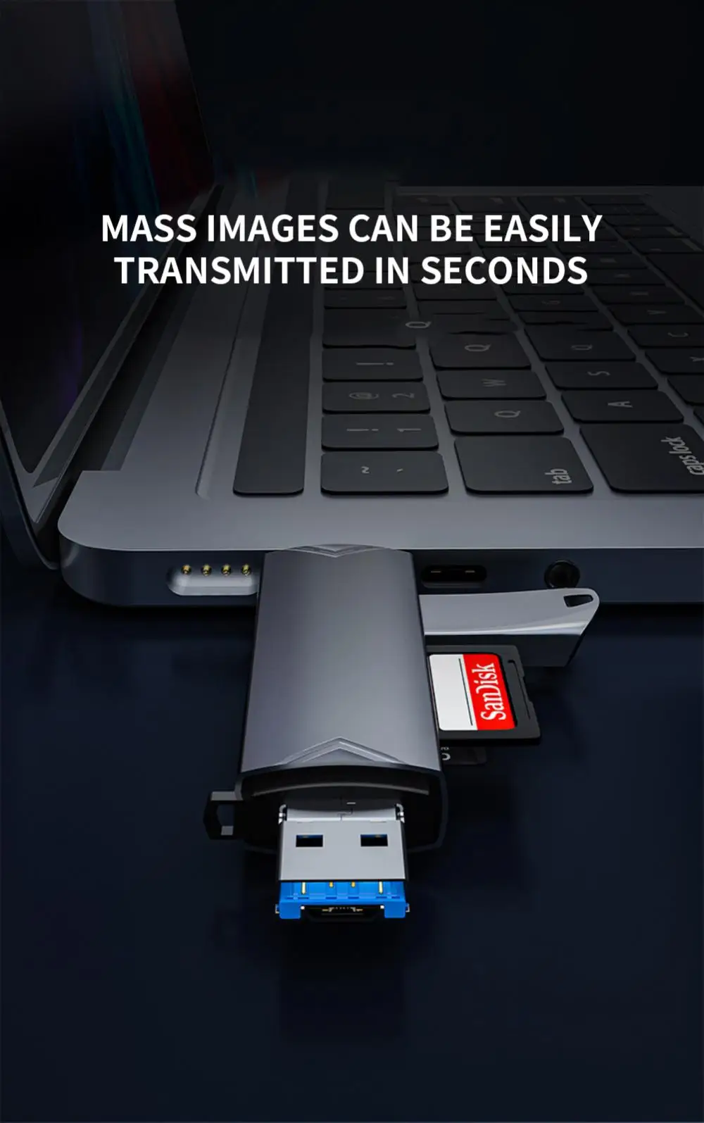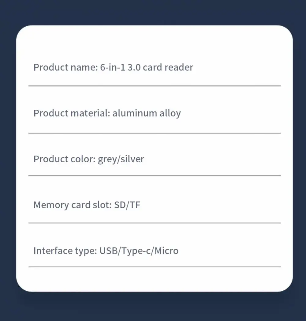 4. 【Duradero y compacto】. La carcasa del lector de tarjetas de memoria está hecha de material de aleación de aluminio duradero, lo que lo hace seguro y estable. El diseño delgado es fácil de guardar en la bolsa o el bolsillo de la cámara.