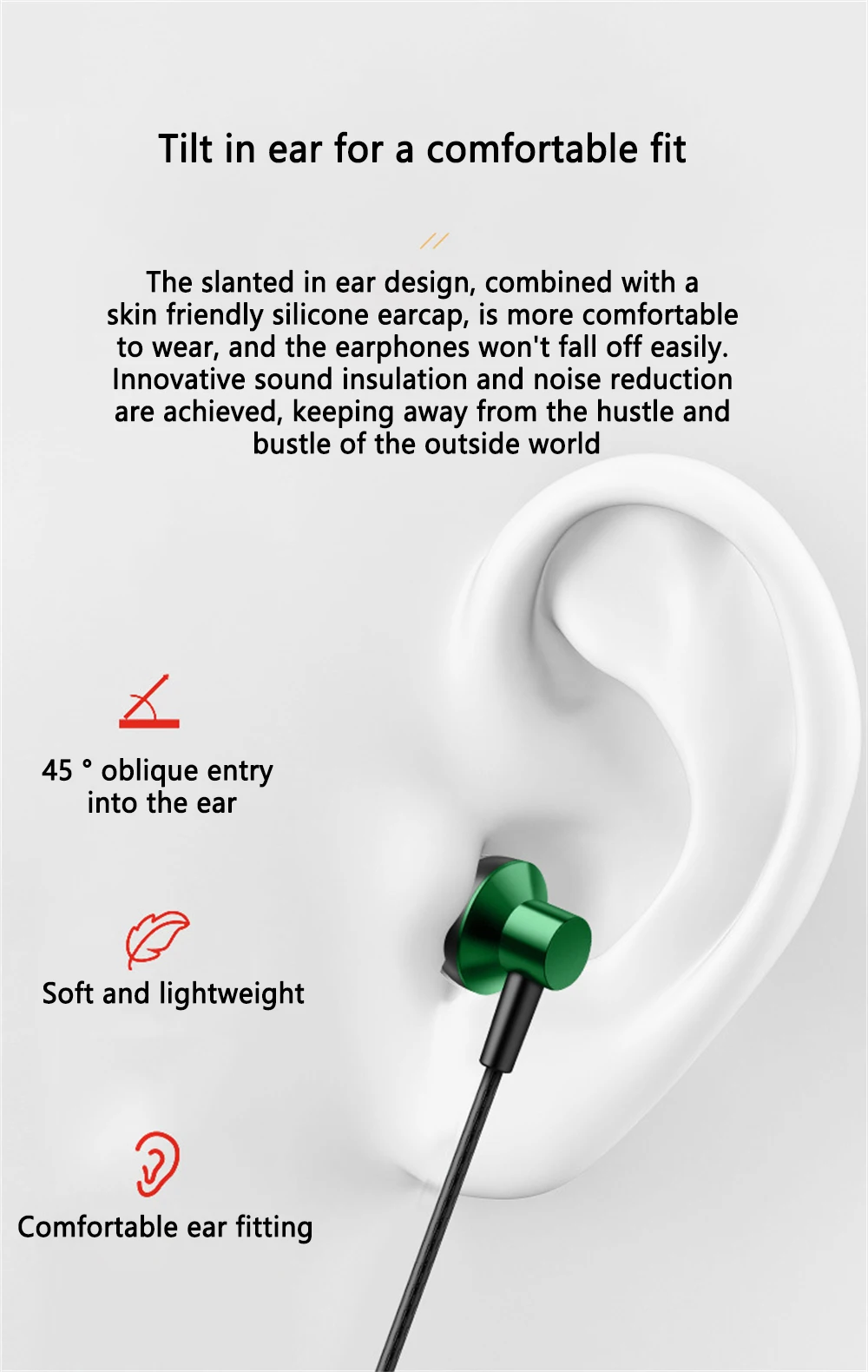 -Diseño inclinado en la oreja, combinado con tapones de silicona amigables con la piel, más cómodos de llevar, los auriculares no se caen fácilmente, reducción de ruido de aislamiento acústico innovador, lejos del mundo exterior, artículos ruidosos
