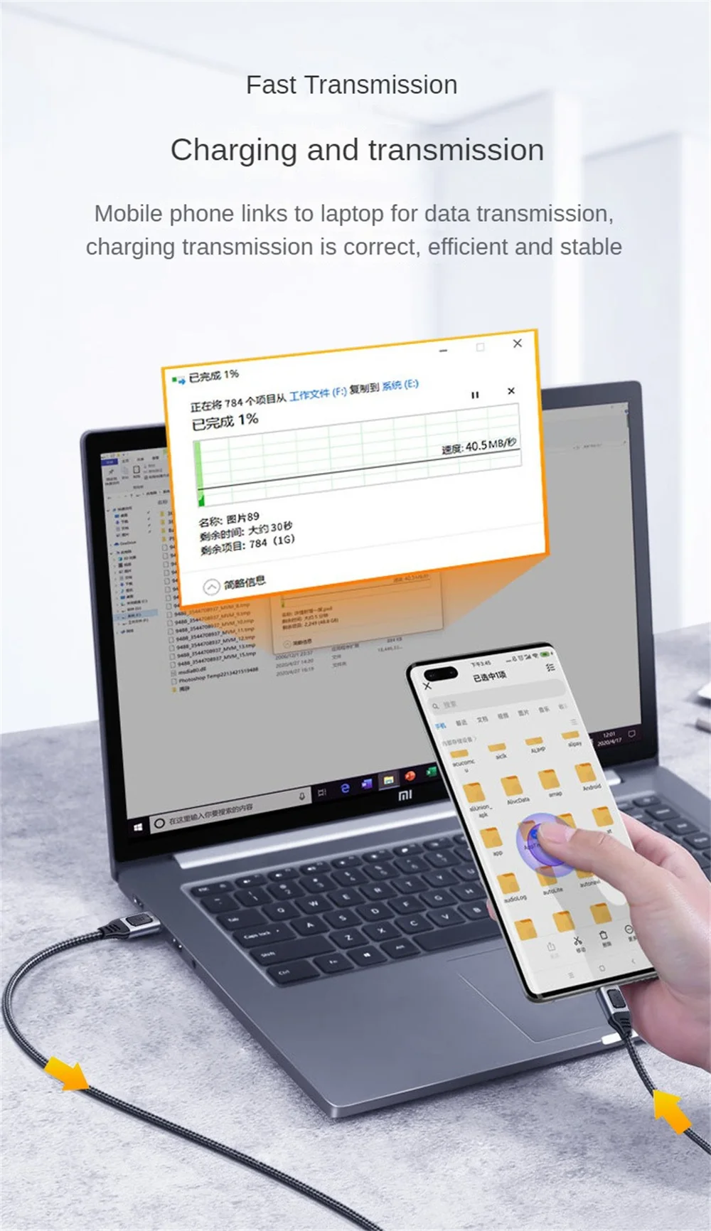 3. 【Transmisión rápida】: el teléfono móvil está conectado al ordenador portátil para la transmisión de datos, la carga y la transmisión son correctas, eficientes y estables.