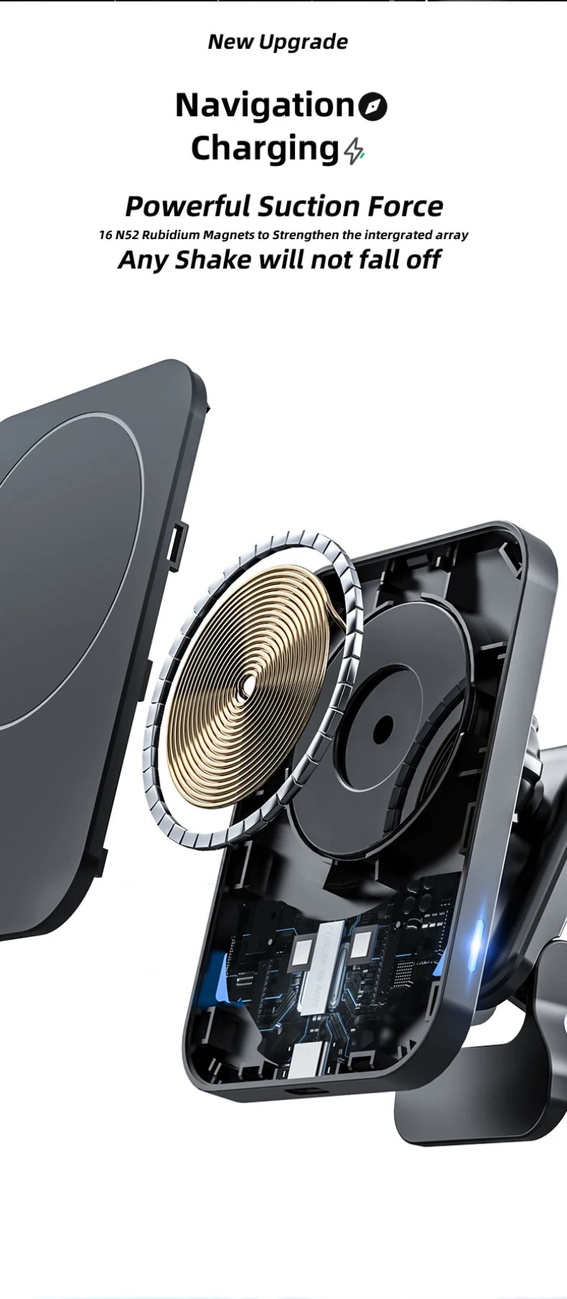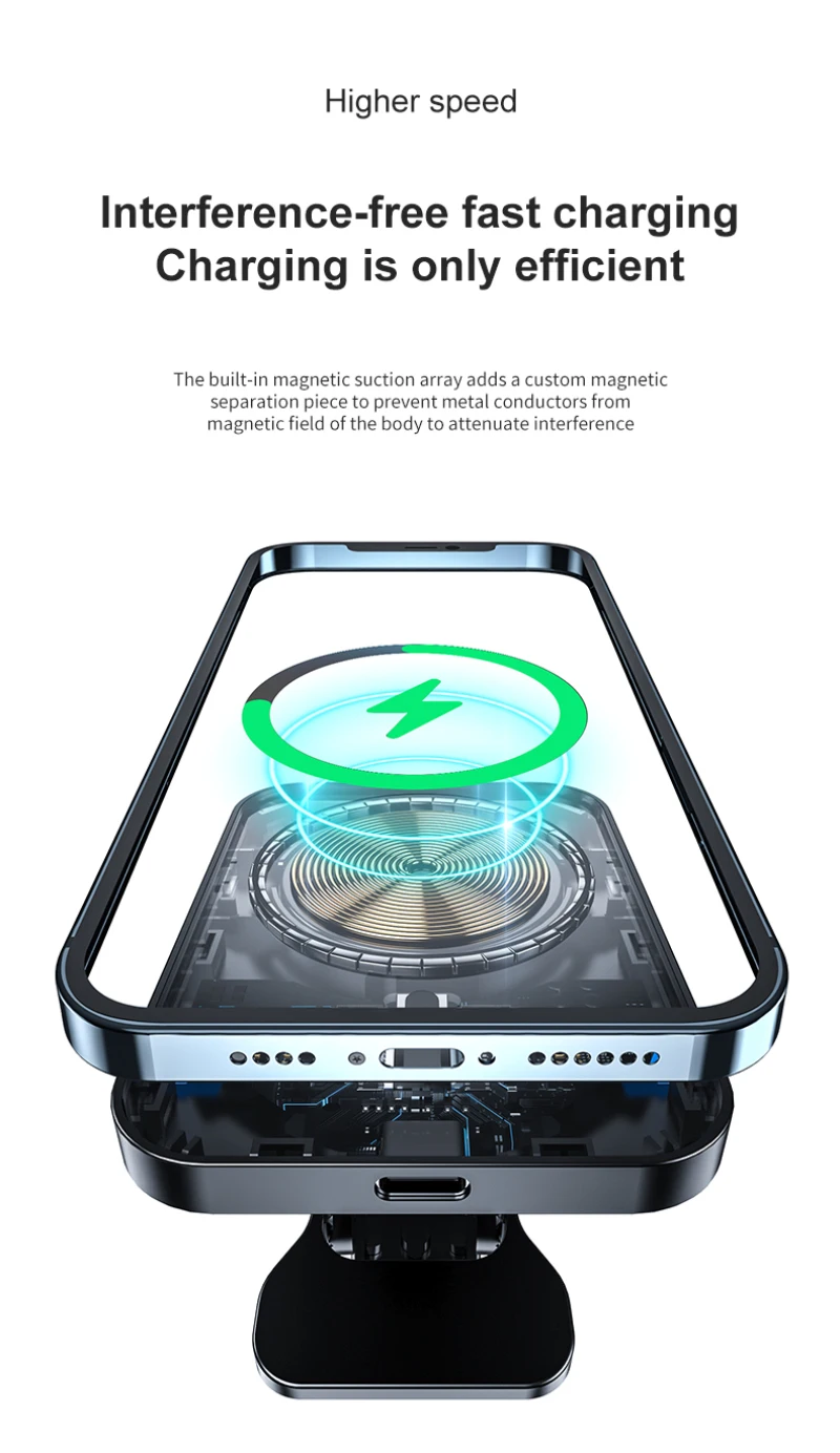 2. Fuerte Magnetismo: el potente magnetismo fija el teléfono sin deslizarse, permitiendo que su teléfono esté completamente concentrado en la placa de carga para acelerar la carga.