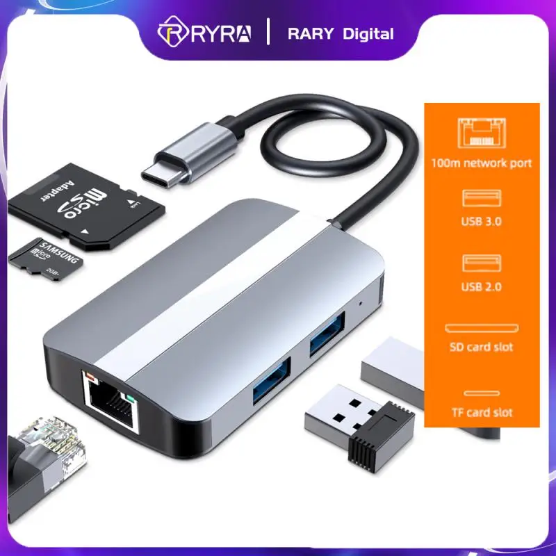 Comprar RYRA-concentrador de red 5 en 1 para ordenador portátil, adaptador USB 3,0 para estación de acoplamiento de 5 puertos, RJ45, USB2.0, tarjeta TF/SD, divisor Macbook tipo C para computadora Mac