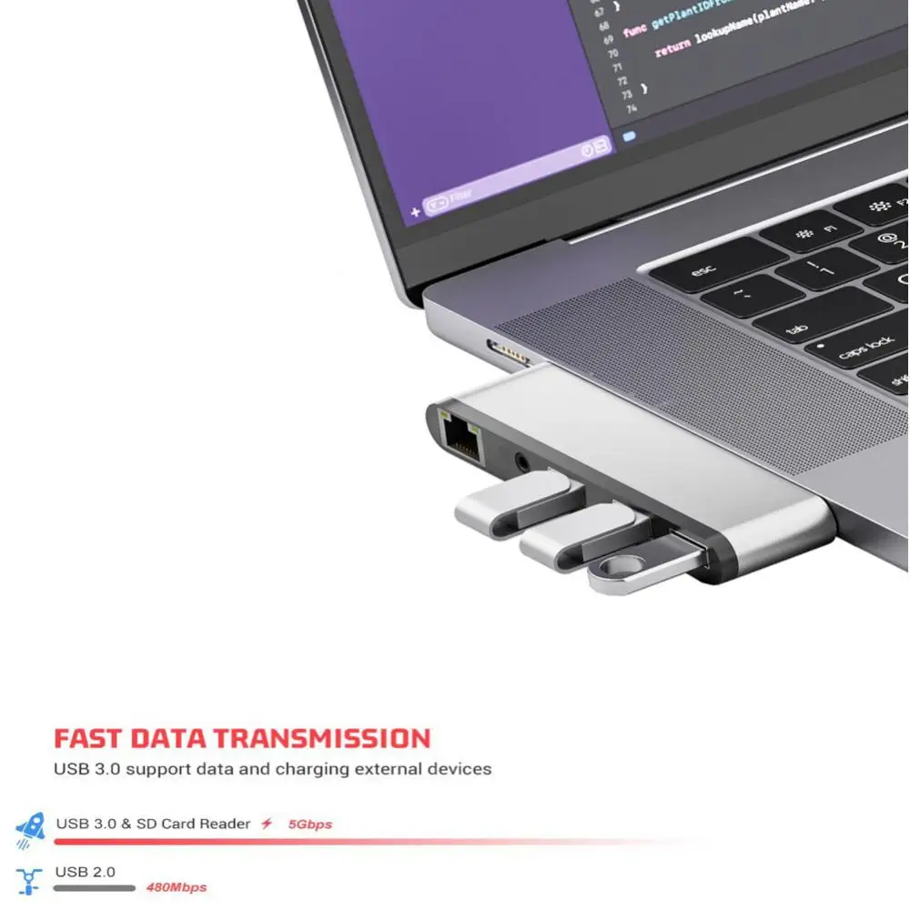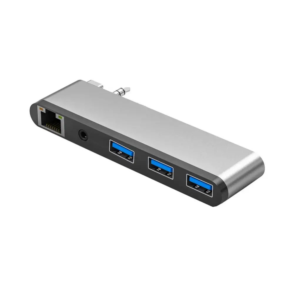 Concentrador USB C 5 en 1 con 3 puertos USB 3,0 100/1000 Mbps RJ45 Lector de tarjetas de conector de audio Estación de acoplamiento de escritorio tipo C de súper velocidad