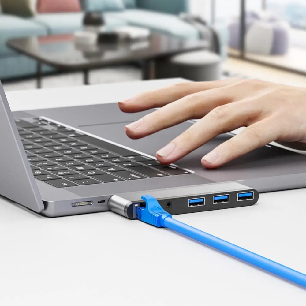 Comprar RYRA-Hub 5 en 1 con 3 puertos USB 3,0, 100/1000 Mbps, RJ45, conector de Audio, lector de tarjetas, estación de acoplamiento de escritorio tipo C, supervelocidad