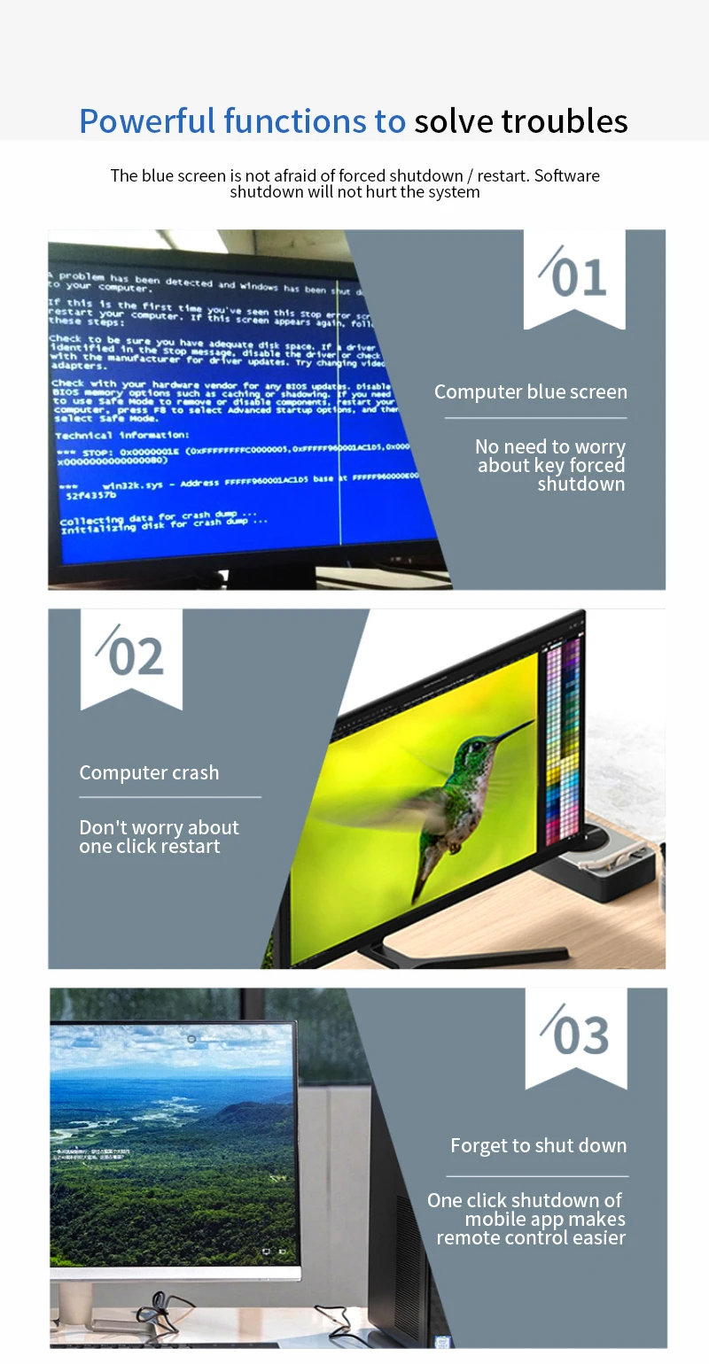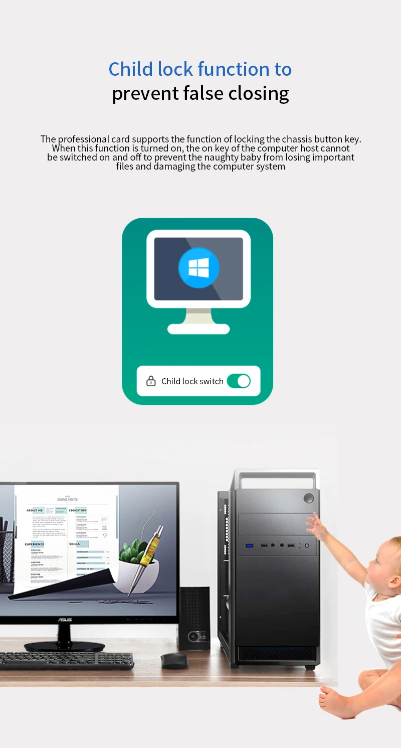 No solo la función de "encendido/apagado", también admite la función de "reinicio y reposo forzado", para evitar daños en su sistema informático.
