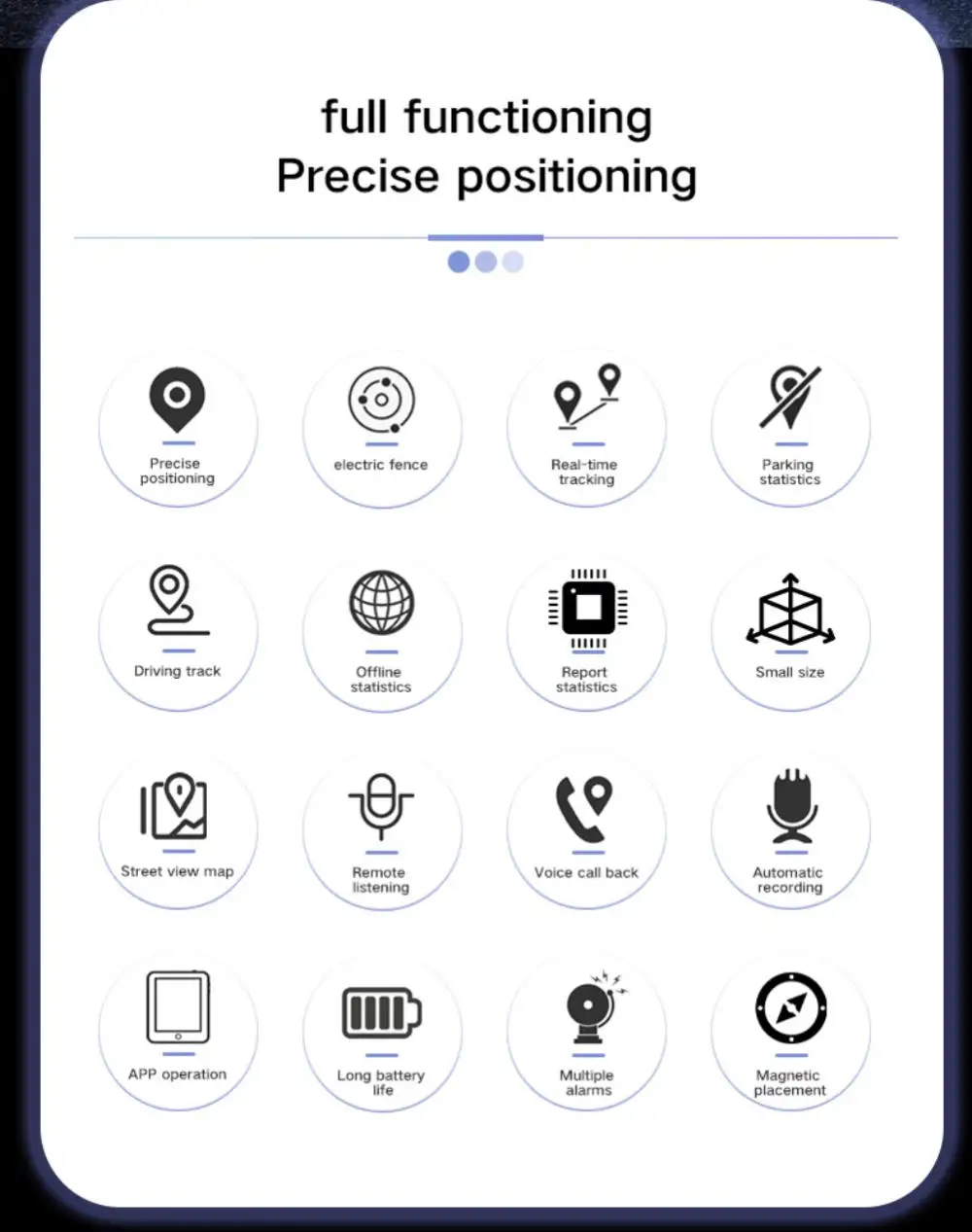 Functions: remote recording, voice control recording, high-definition GPS positioning, real-time tracking, historical track, electronic fence, remote switch, AAP, computer terminal, message operation, SOS for help.