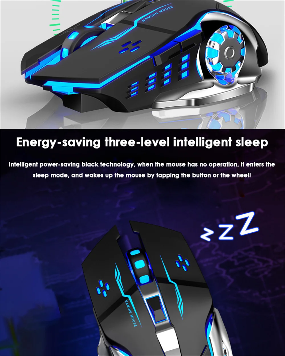 Tecnología negra inteligente que ahorra energía, entra en modo de suspensión cuando el ratón no esté funcionando, toca la tecla o rueda de desplazamiento para despertar el ratón.
