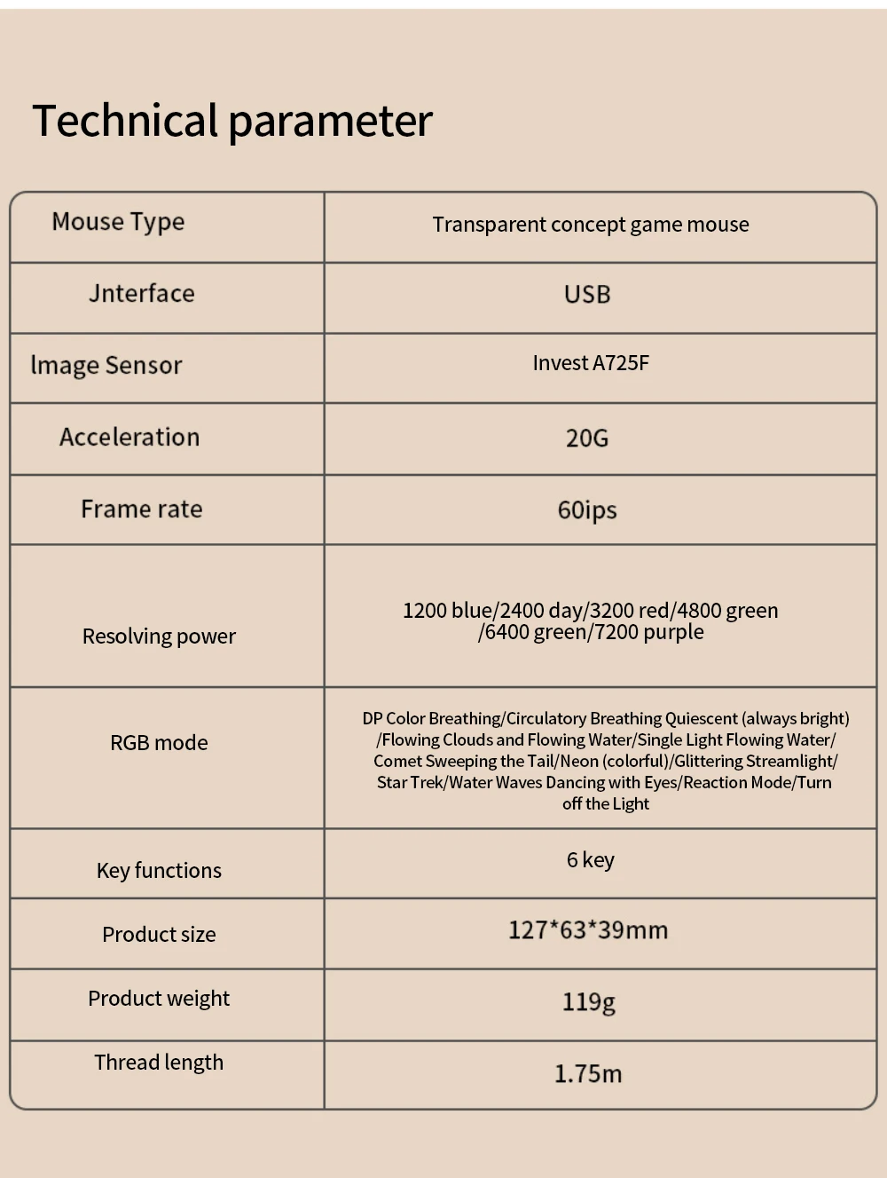 Resolución: 1200 azul/2400 Blanco/3200 rojo/4800 verde/(6400 verde/7200 púrpura modo RGB: respiración de Color DPI/respiración circulante/estática (siempre encendida)/Agua que fluye/Agua de una sola luz/Extremo de barrido del cometa/Neón (colorido)/Color intermitente/Star Trek/Onda de agua/Cuidado/Modo de reacción/Apagar las luces