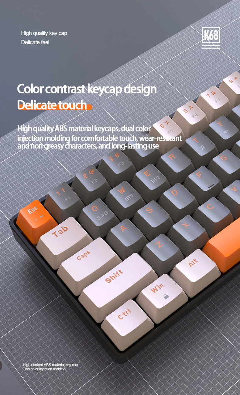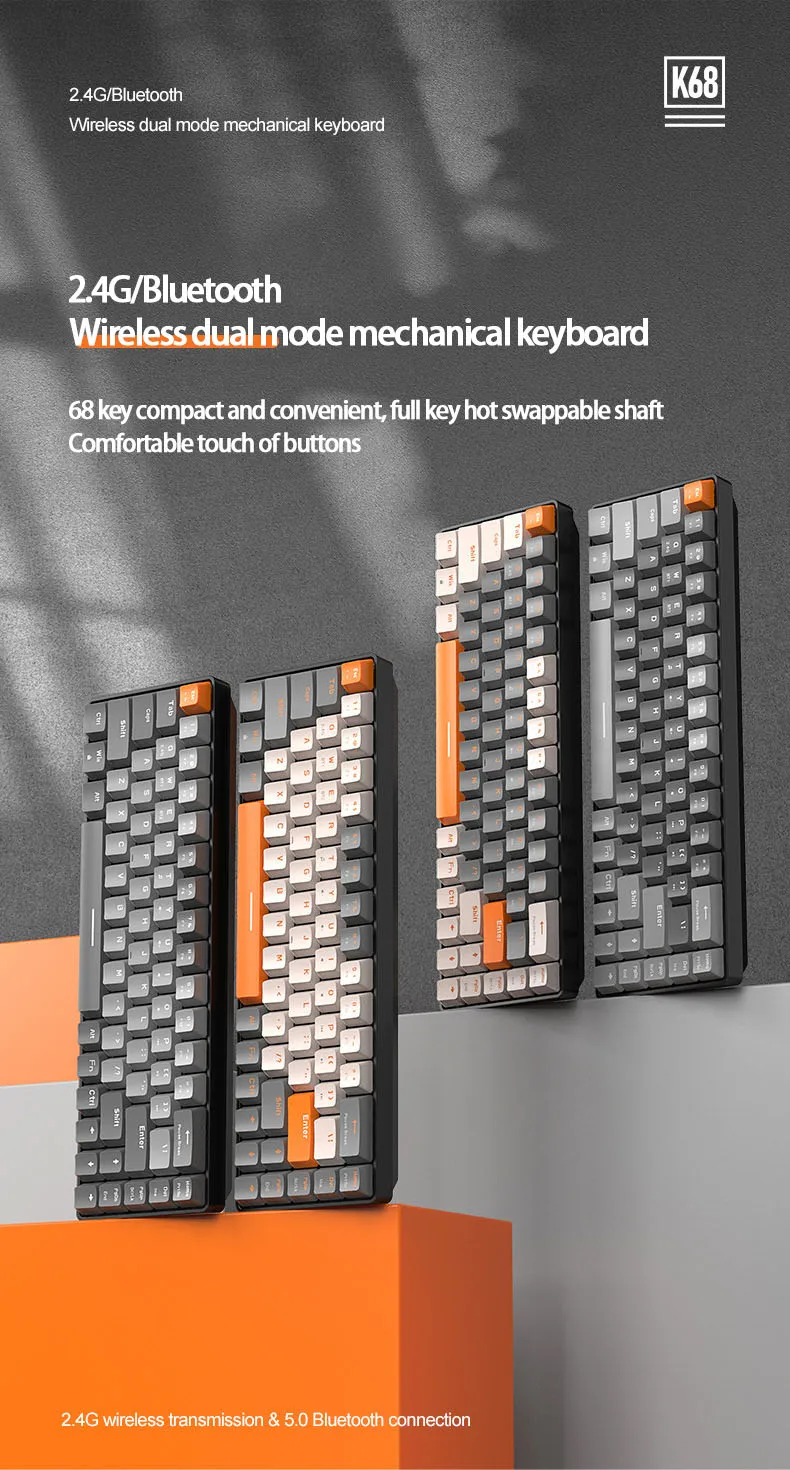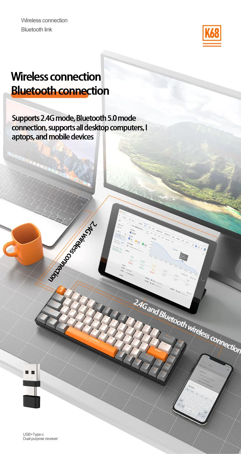 Comprar RYRA-Teclado mecánico inalámbrico K68 para videojuegos, dispositivo de intercambio en caliente, 2,4G/BT5.0, 68 teclas, PBT