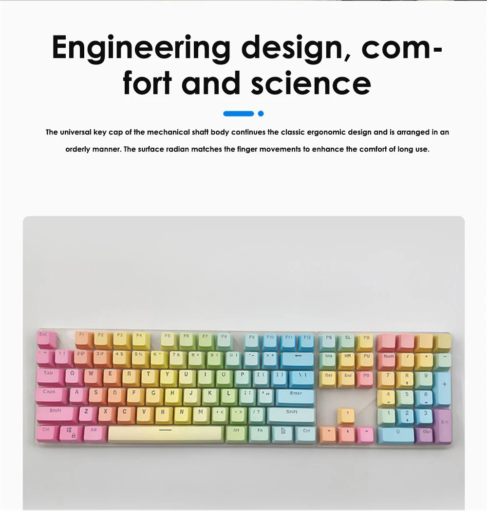 1. El exquisito diseño de teclado de 104 teclas ahorra más espacio de escritorio y proporciona más espacio de operación para el ratón, que es adecuado para usar con portátiles.