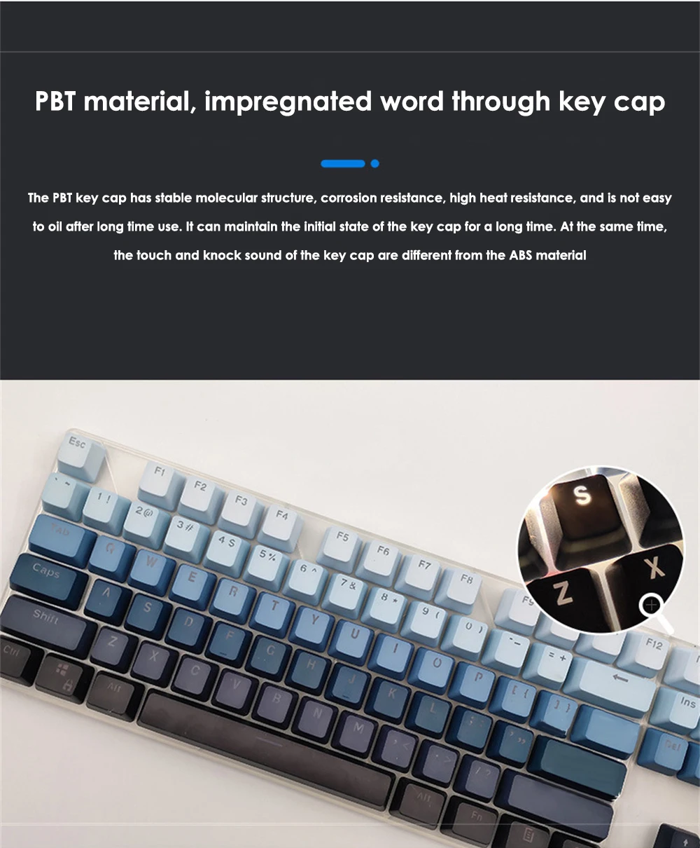 2 la tapa de la llave PBT tiene una estructura molecular estable, alta resistencia a la corrosión y resistencia al calor, y no es fácil de engrasar después de un uso prolongado, que puede mantener el estado inicial de la tapa de la llave durante mucho tiempo.
