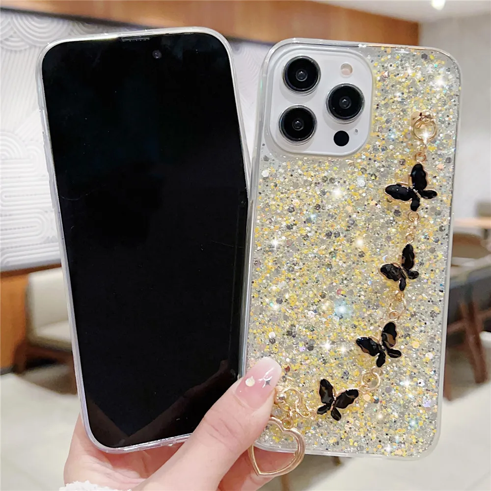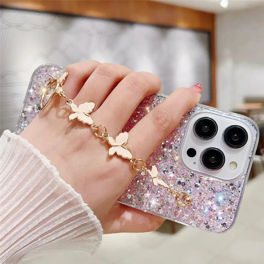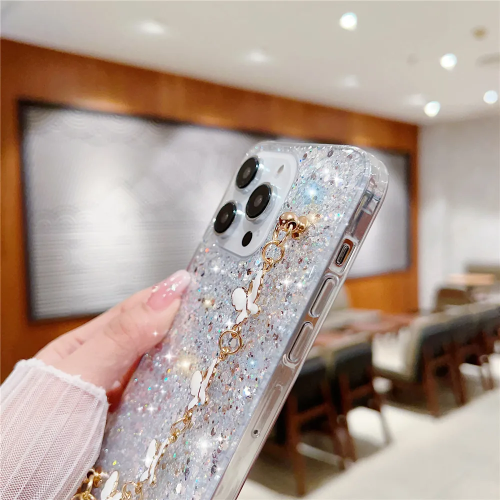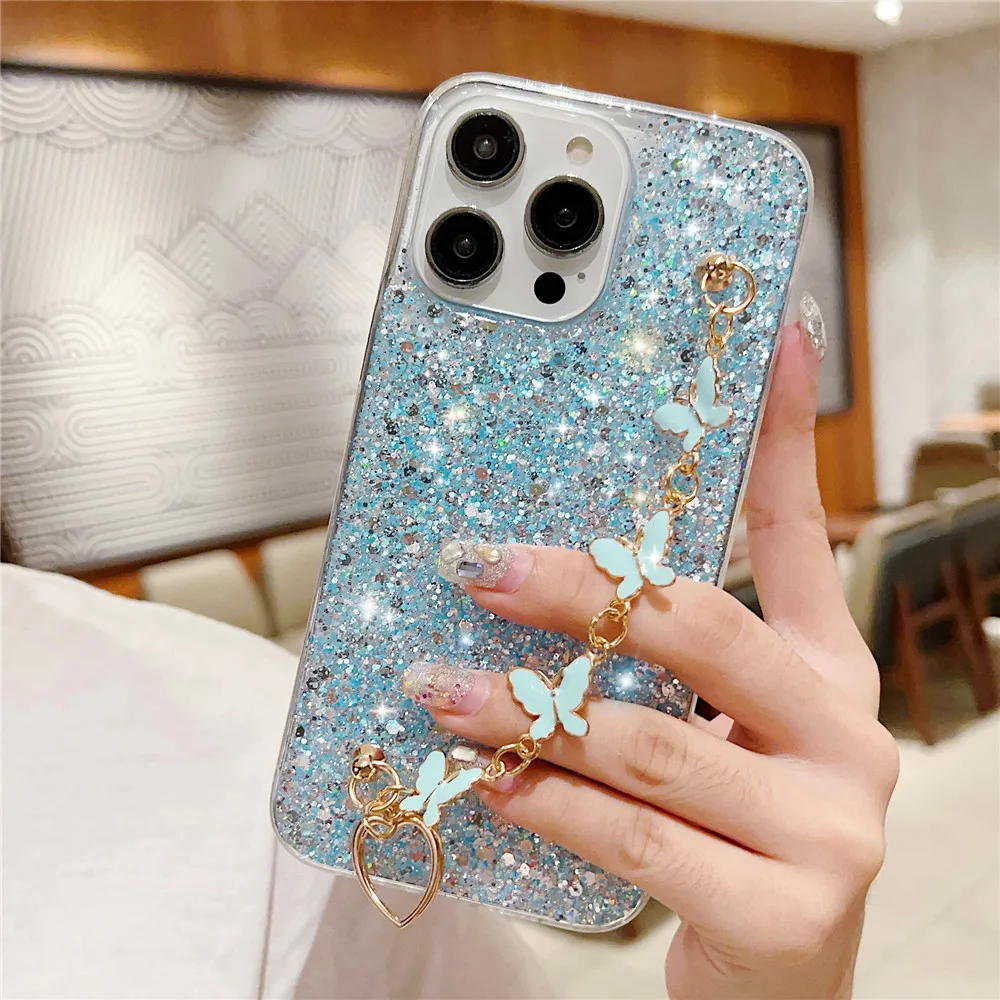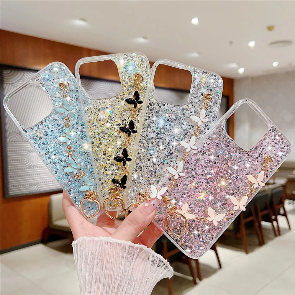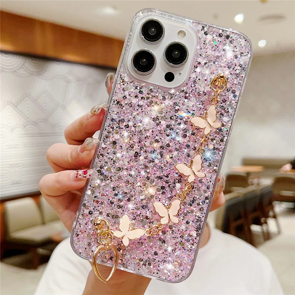 S 21 22 23 funda de teléfono con pulsera de mariposa y purpurina para Samsung Galaxy S24 S23 S22 S21 S20 FE Plus Ultra Note 20 funda suave y brillante