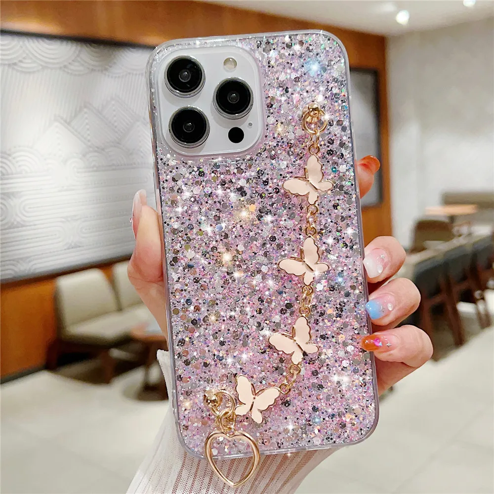 S 21 22 23 funda de teléfono con pulsera de mariposa y purpurina para Samsung Galaxy S24 S23 S22 S21 S20 FE Plus Ultra Note 20 funda suave y brillante
