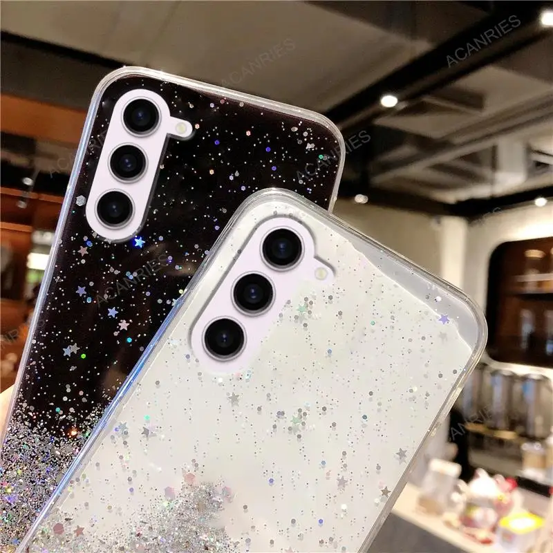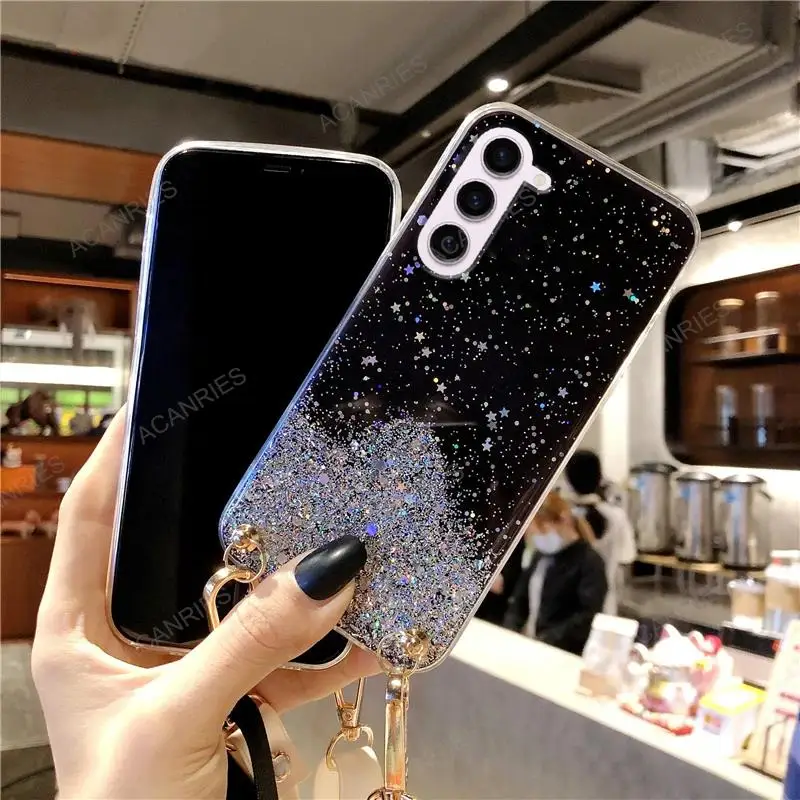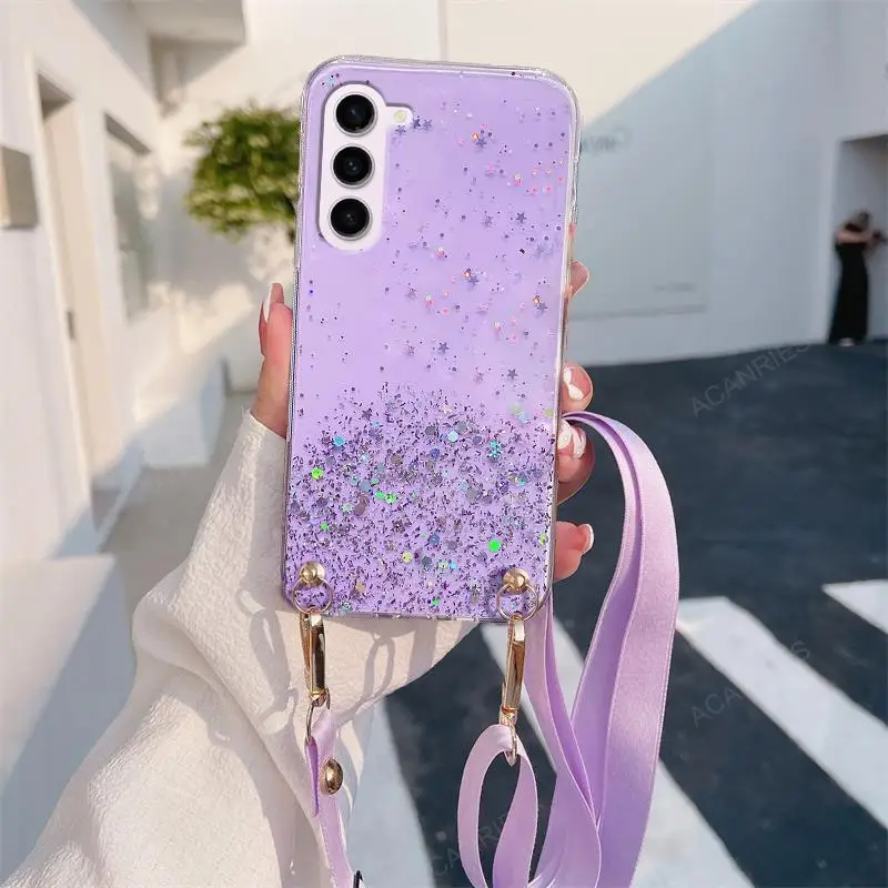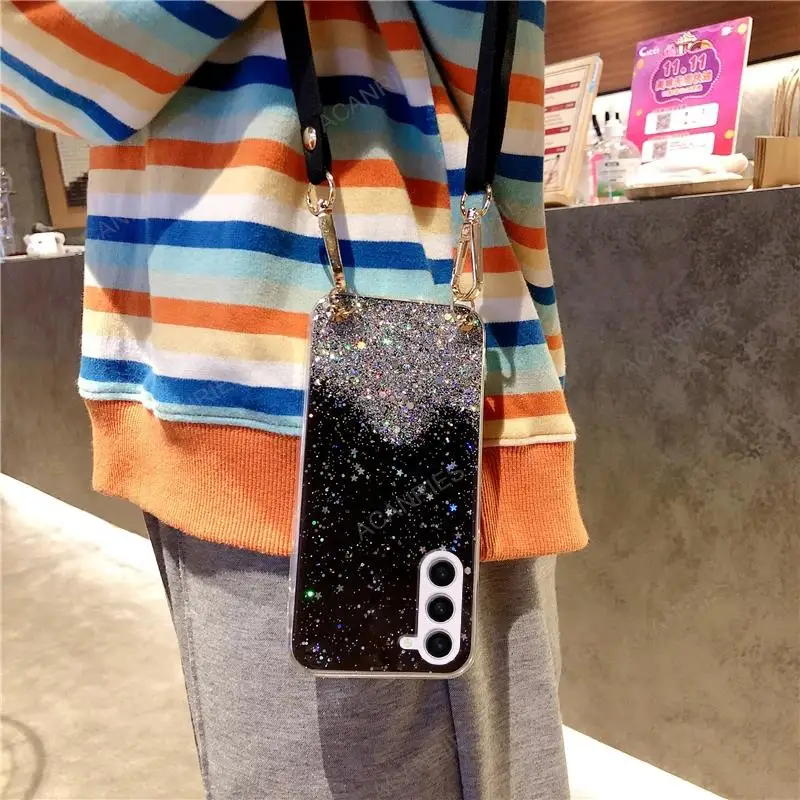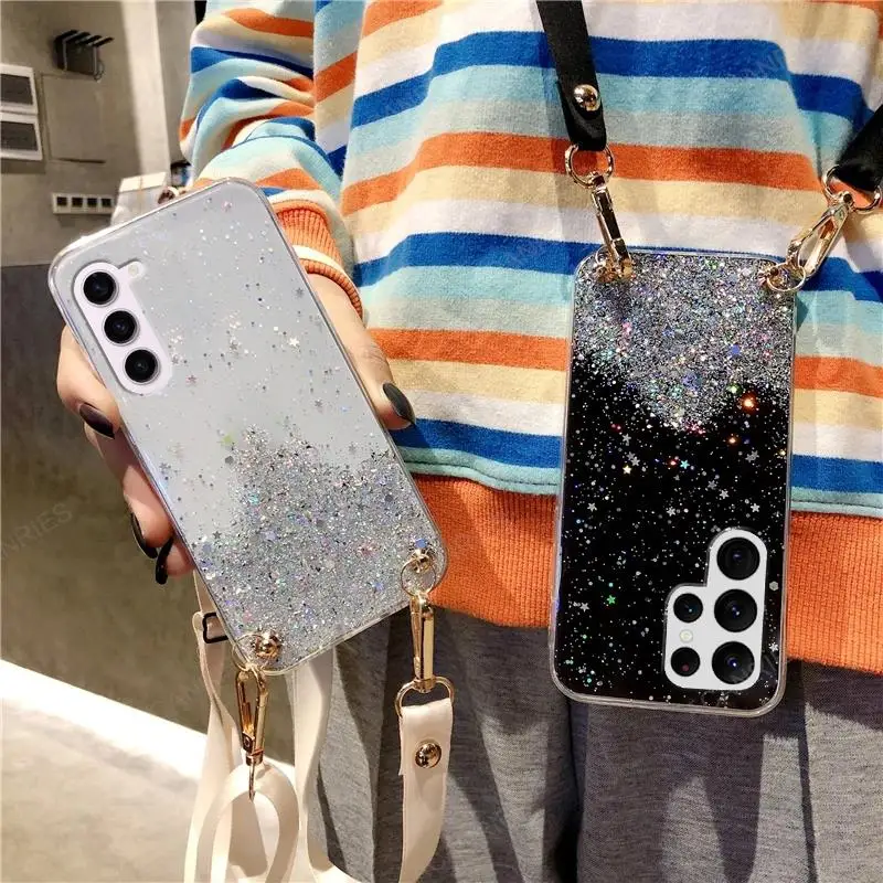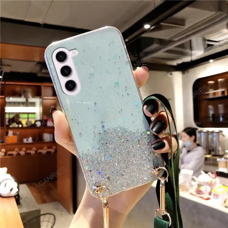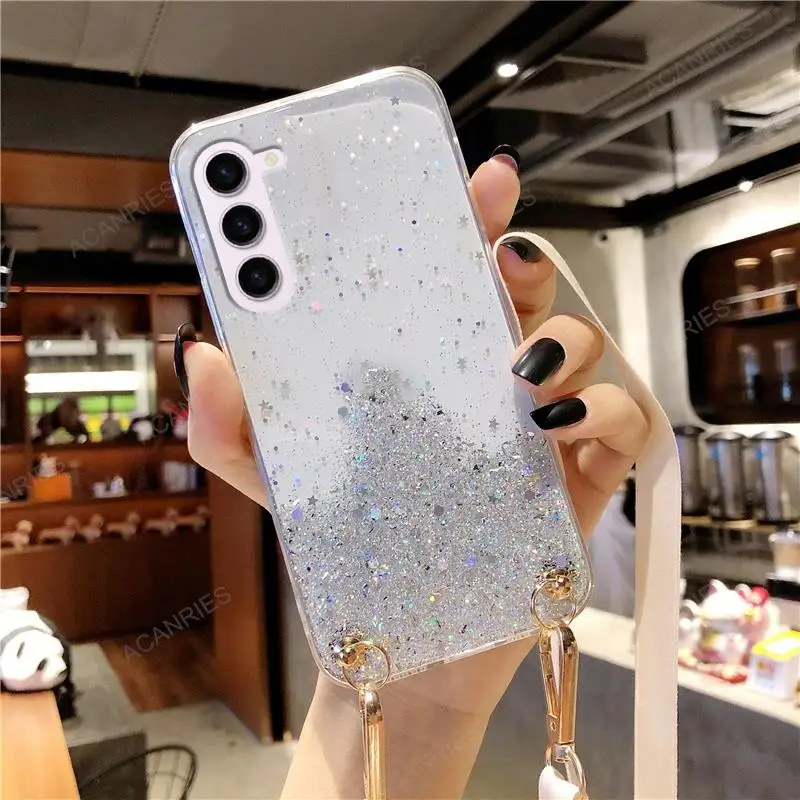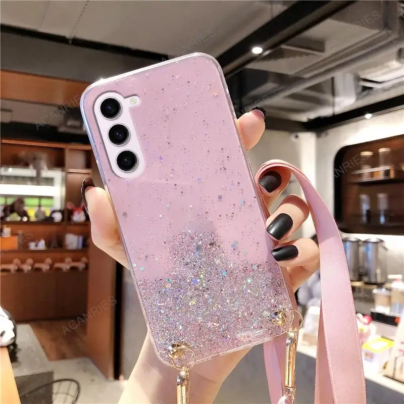S 24 23 22 21 Funda transparente con cordón cruzado y purpurina para Samsung Galaxy S23 S22 S24 S21 S20 Fe Plus Ultra 5g Funda de silicona con cordón