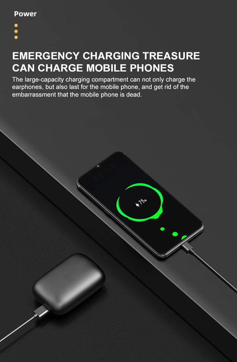 2. La caja de carga de 2200mAh puede cargar completamente 2 auriculares unas 15 veces, proporcionando más tiempo de música.
