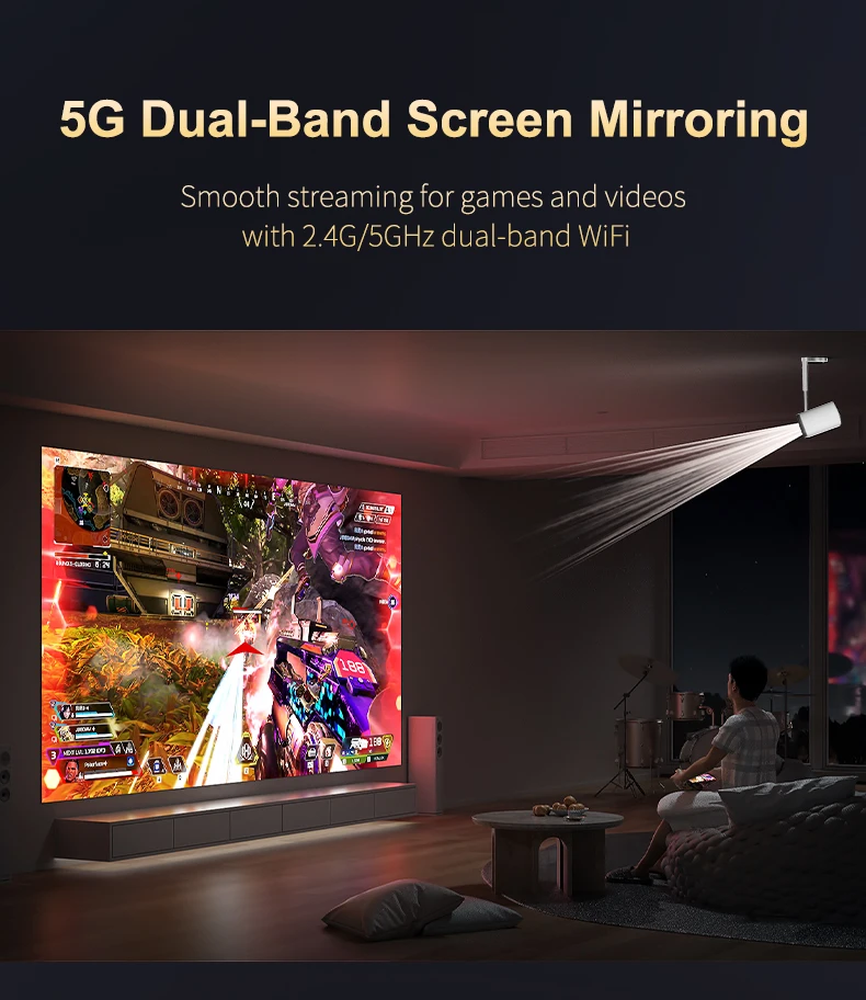 【Proyector portátil con WIFI y Bluetooth】Admite duplicación de pantalla inalámbrica para dispositivos IOS, Android y Windows.Con la tecnología Wi-Fi de 5 GHz, puede mostrar fácilmente la pantalla de sus dispositivos sin adaptadores ni aplicaciones adicionales.