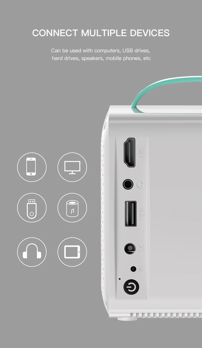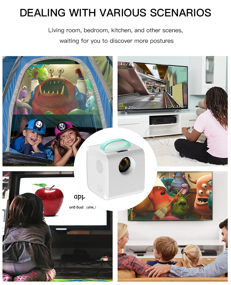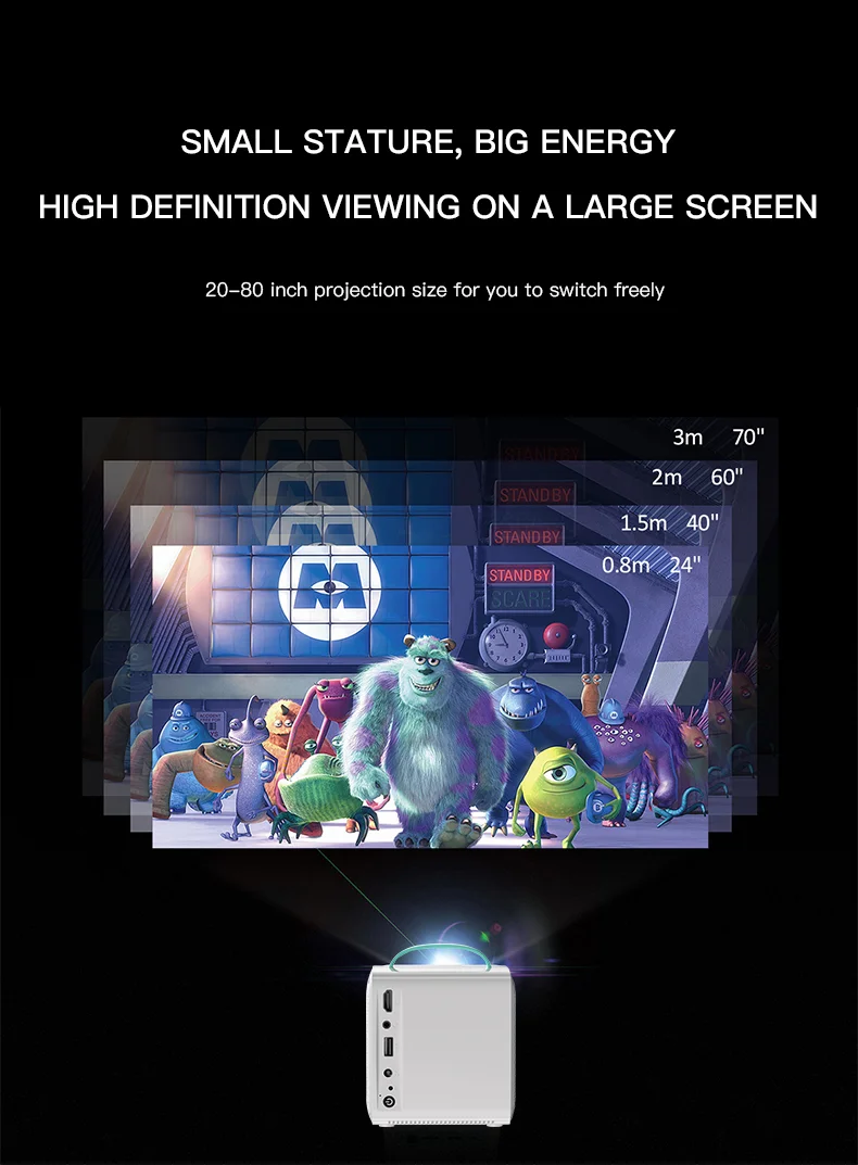 3) Tamaño pequeño, pantalla grande, puede proyectarse de 20 a 70 pulgadas.Puede elegir el tamaño adecuado según la situación real para disfrutar de una experiencia de visualización cómoda.