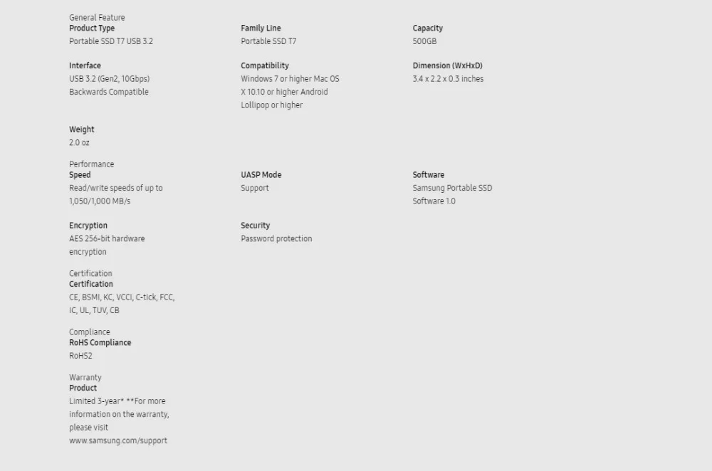 En tegenstelling tot Hdd es. ¡de Draagbare SSD T7 heeft geen bewegende de LAS PARTES DHE het meer bestand tegen schokken! Plus zijn massief unibody de aluminio constructie voegt verdere bescherming... houden uw gegevens veilig van valt tot 6 ft * ¡De T7 es vertrouwen ondersteund puerta een 3-jaar beperkte garantie!