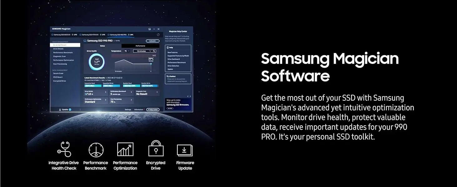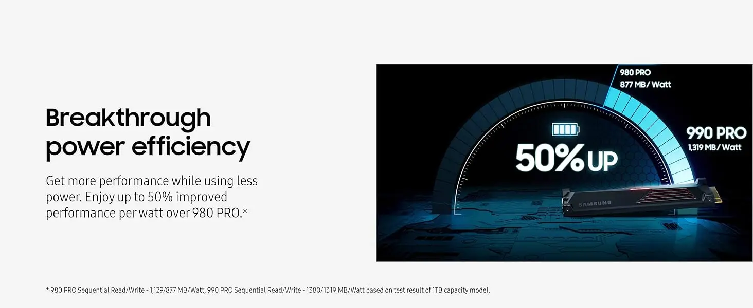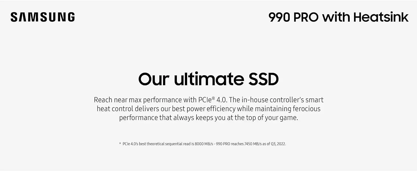 VELOCIDAD ARDIENTE. FRÍO VICTORIA: Considere esto como un código de trucos; Nuestro Samsung 990 PRO Gen 4 con disipador de calor SSD le ayuda a alcanzar un rendimiento casi máximo * con velocidades ultrarrápidas y disipador de calor para un mejor control de la temperatura