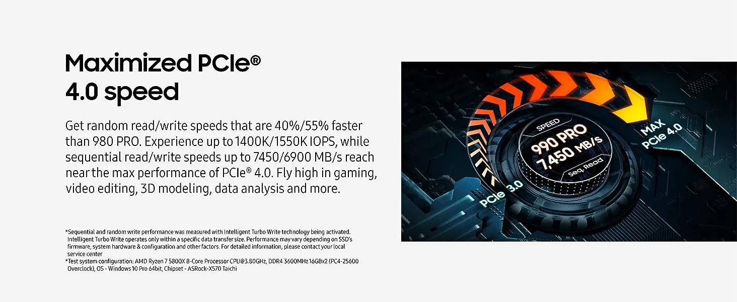 EL SSD MÁS RÁPIDO DE LA MARCA DE MEMORIA FLASH DEL MUNDO: La velocidad que necesita para cualquier ocasión; con velocidades de lectura y escritura de hasta 7450/6900 MB/s, alcanzará un rendimiento casi máximo de PCIe 4,0 para cualquier uso