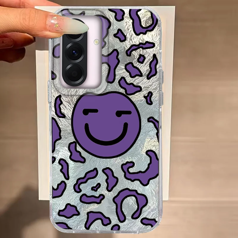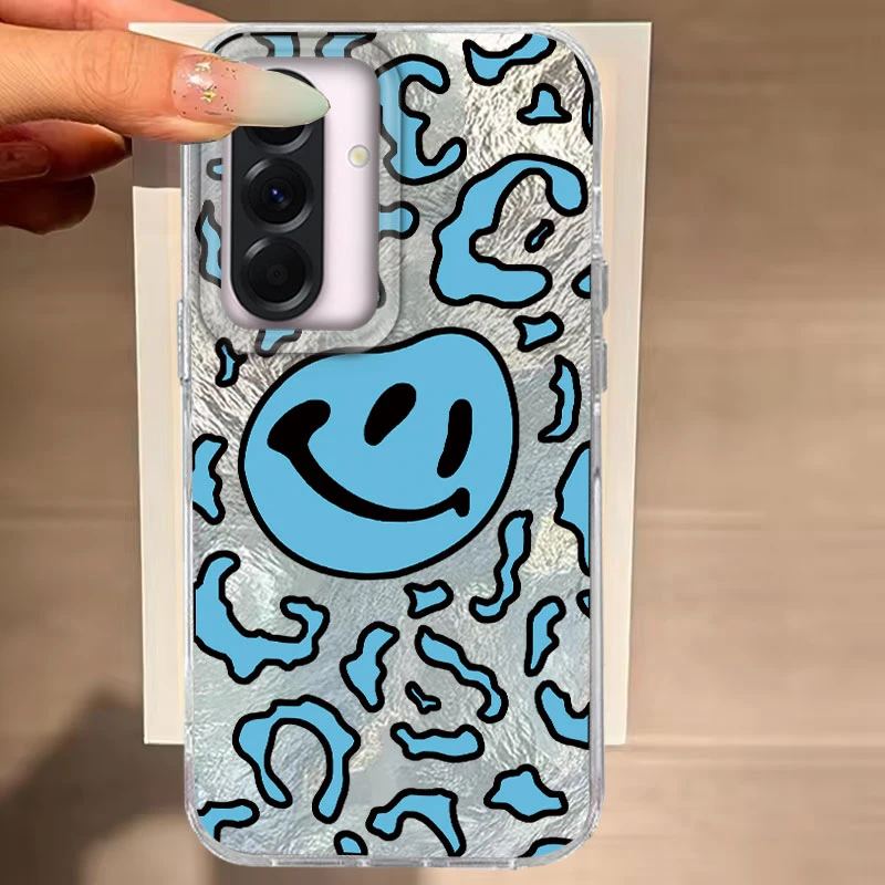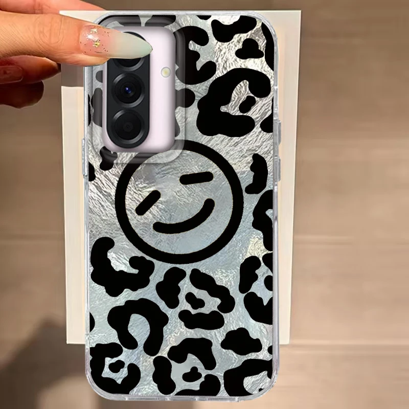 Para Samsung Galaxy A56 A55 A53 A35 A36 A34 A07 A17 A06 A25 A16 A26 A22 A32 A15 funda de teléfono con patrón de vórtice de cara sonriente negra