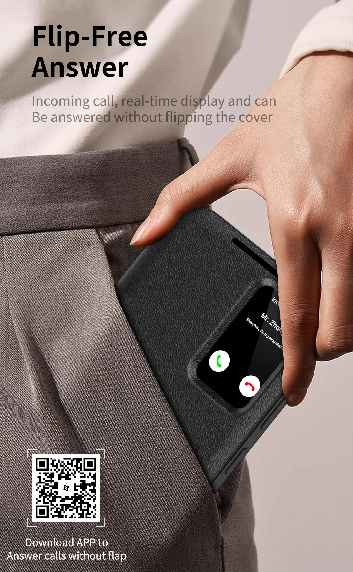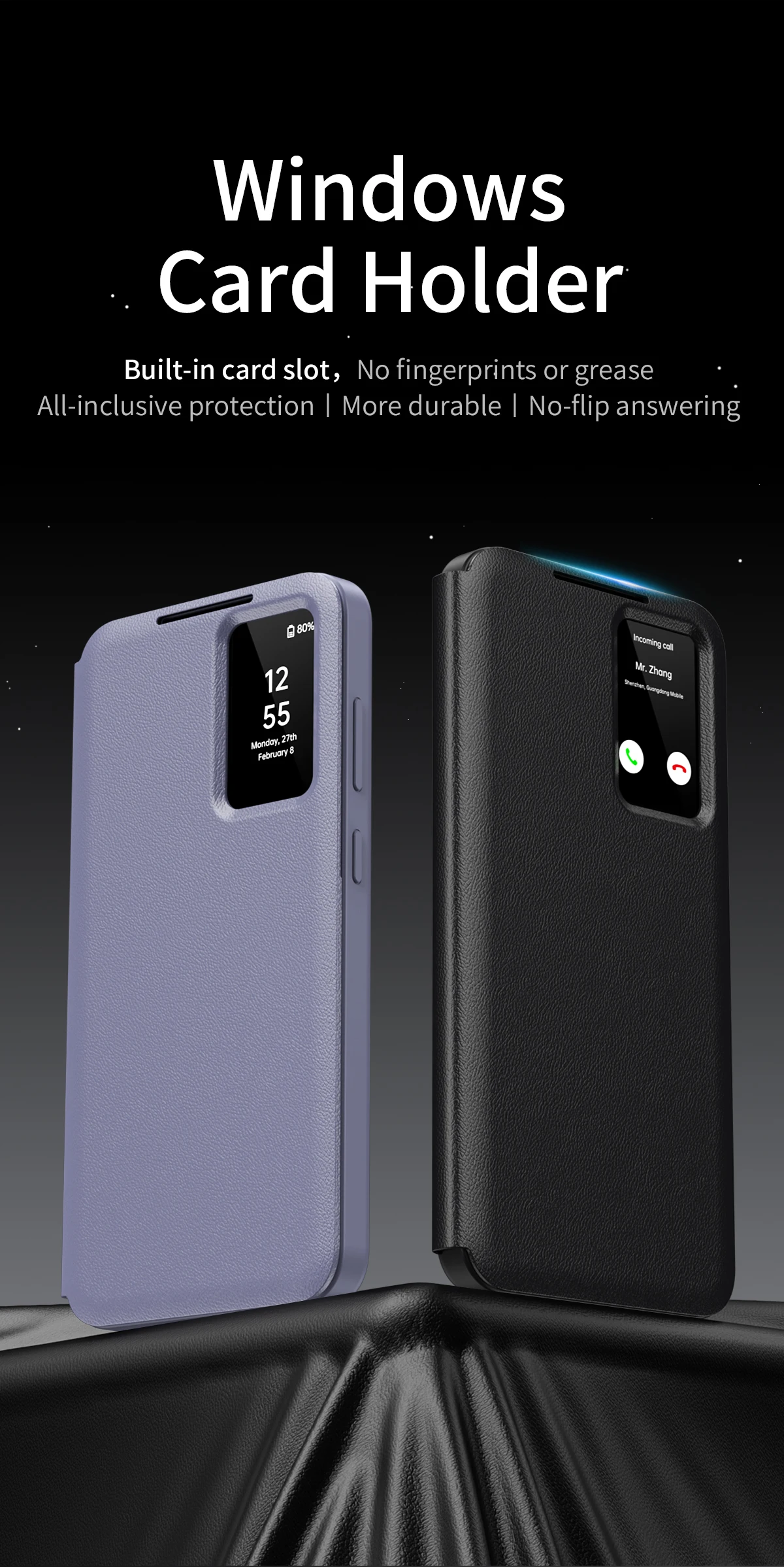 1.Verifique la hora, la batería, las llamadas entrantes y los mensajes sin abrir la funda del teléfono.