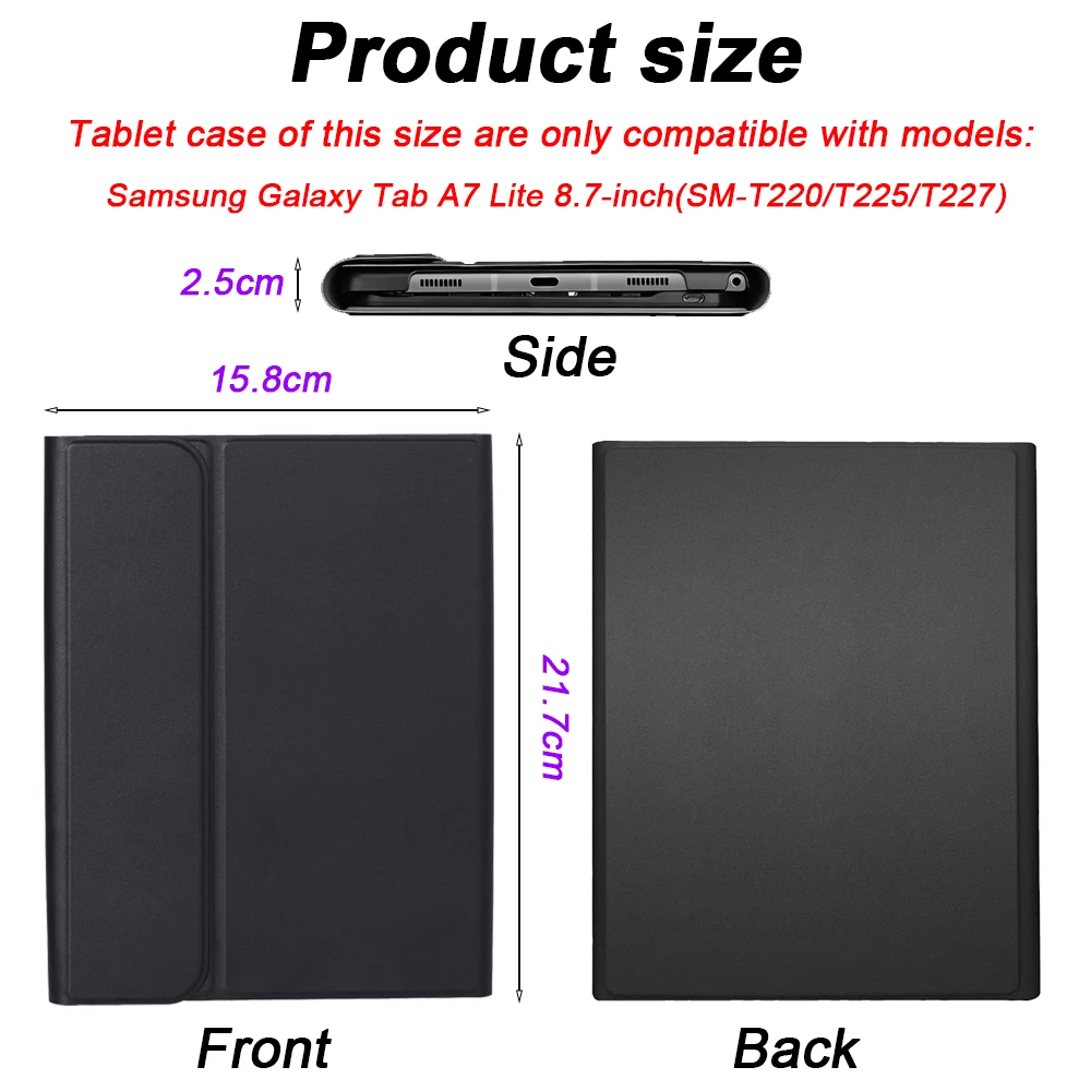 Keyboard size: 8-inch(200*126*6mm){{{The picture in this link shows the appearance of the 10-inch keyboard (but in order to better match Samsung Galaxy Tab A7 Lite, we will send the 8-inch keyboard, and its layout is as the following picture)