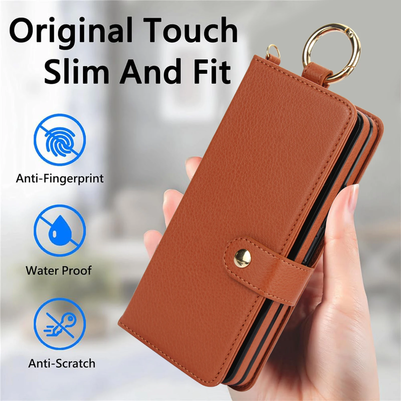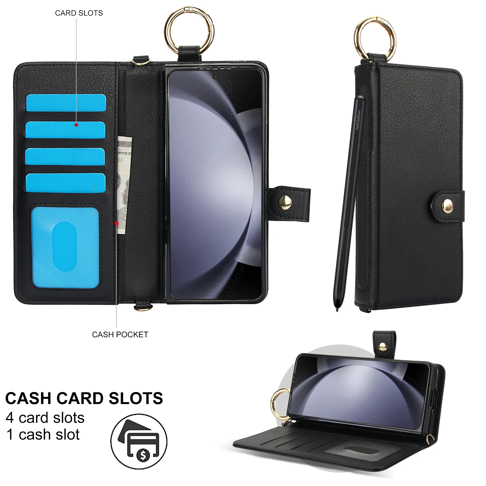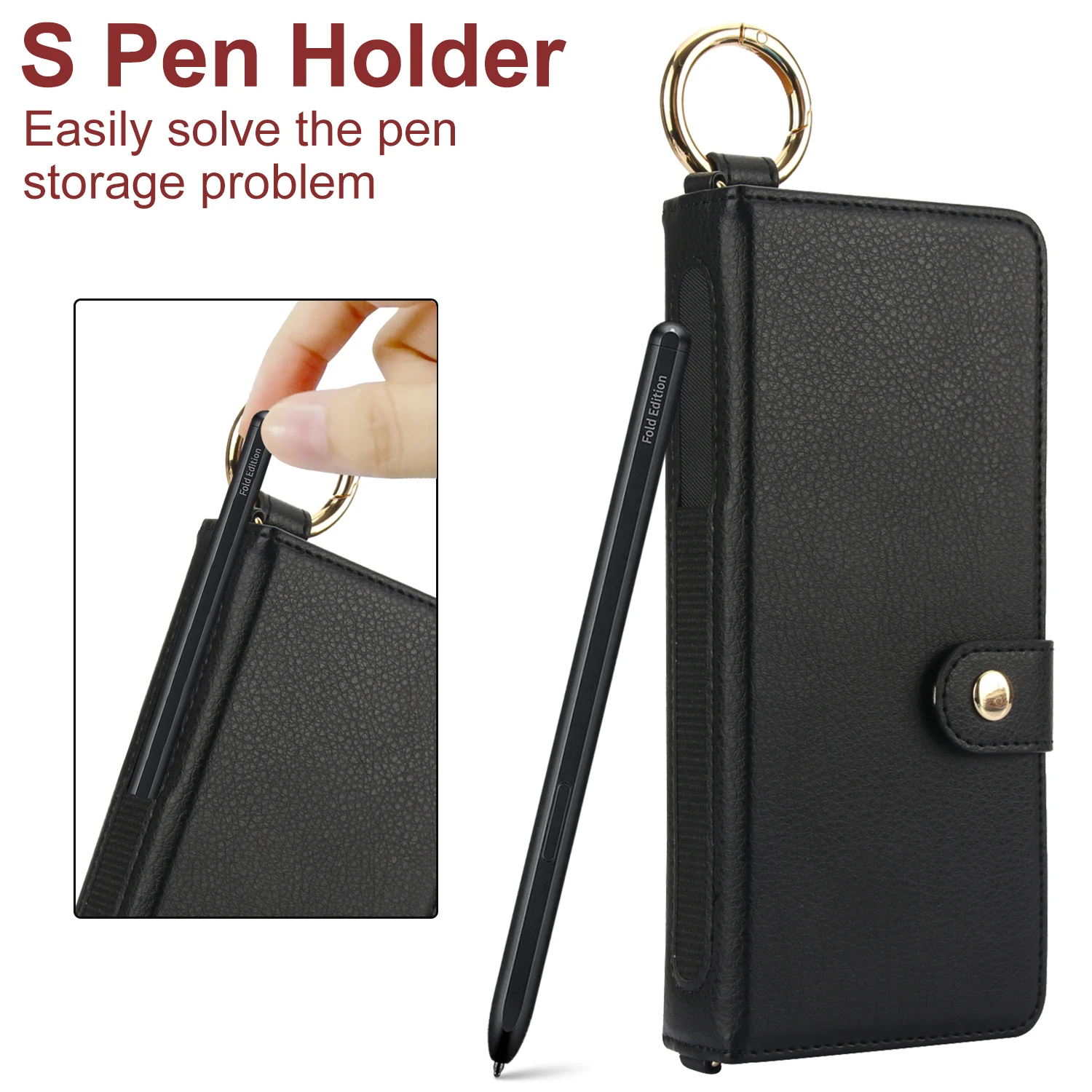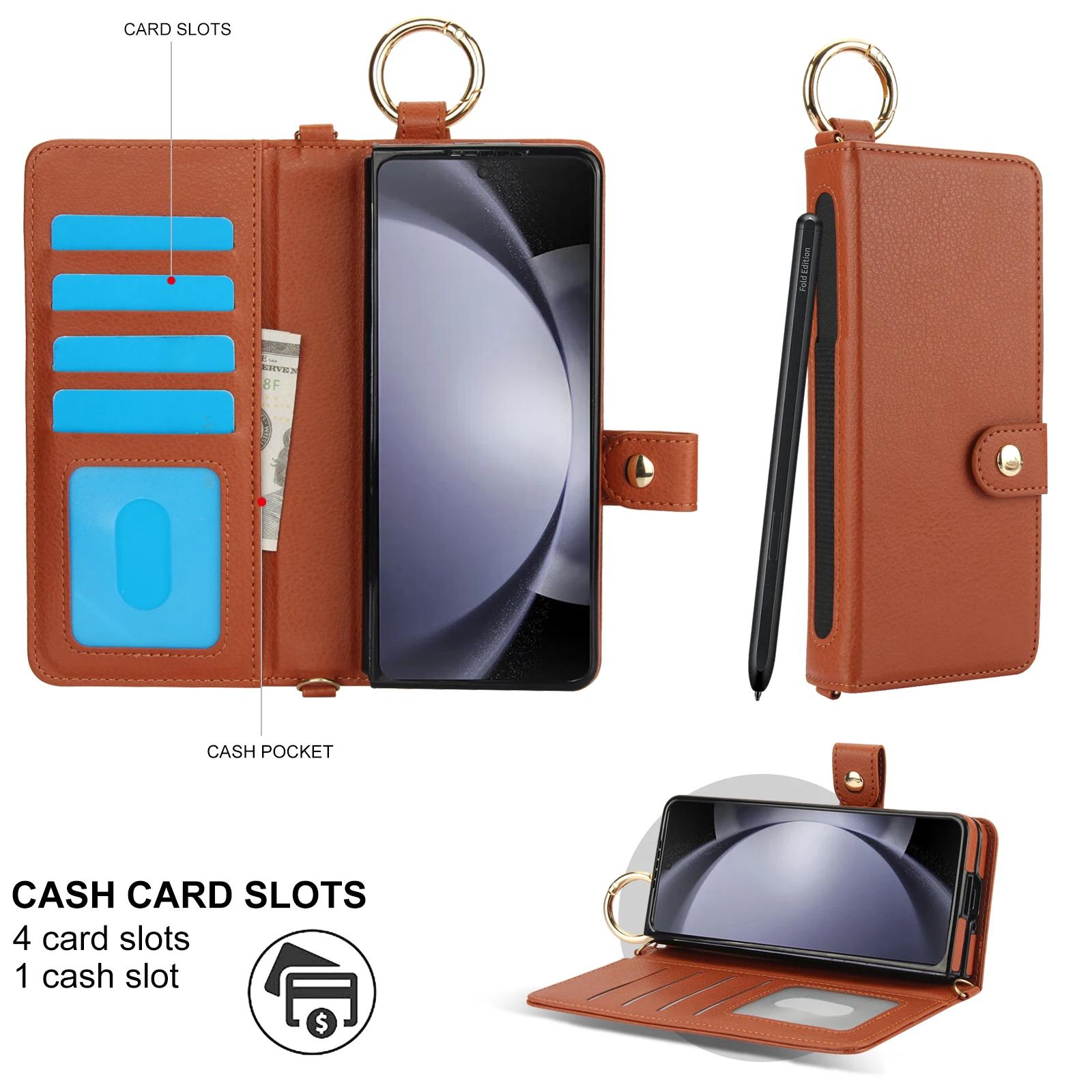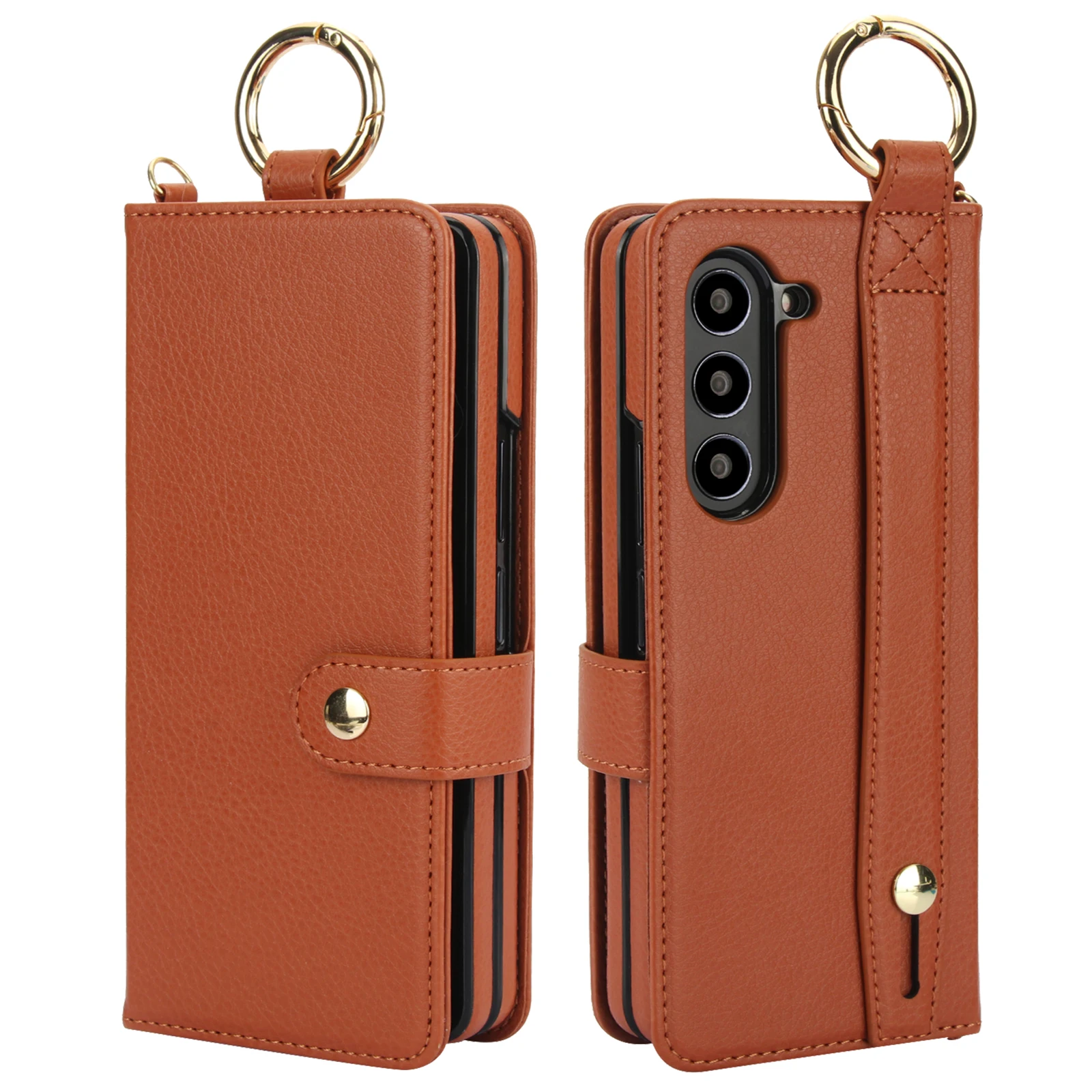 Para Samsung Galaxy Z Fold 7 6 5 4 3 5G cordón cruzado Funda de cuero tipo billetera para tarjetas cuerda para la muñeca funda con soporte abatible con ranura para bolígrafo