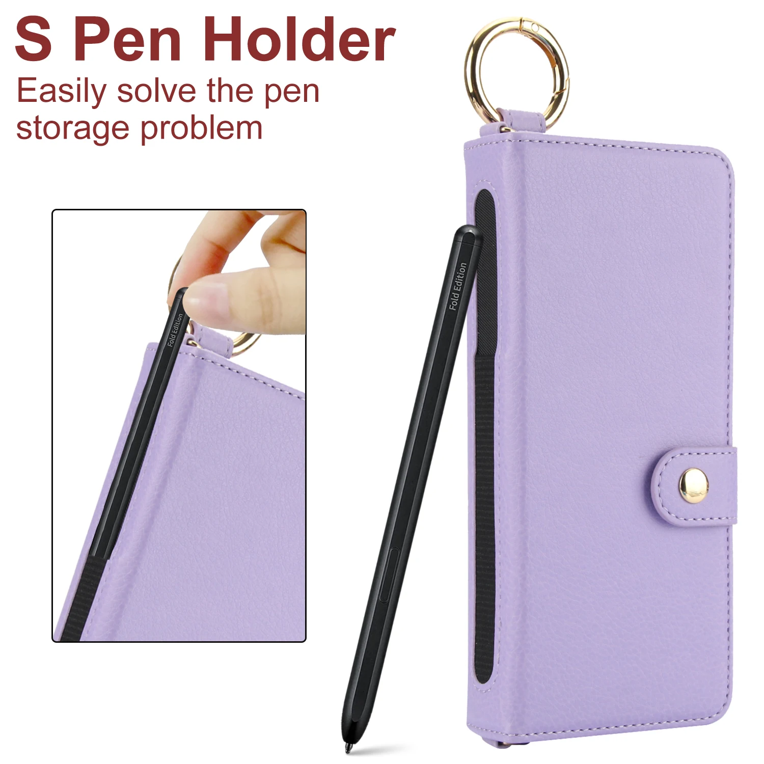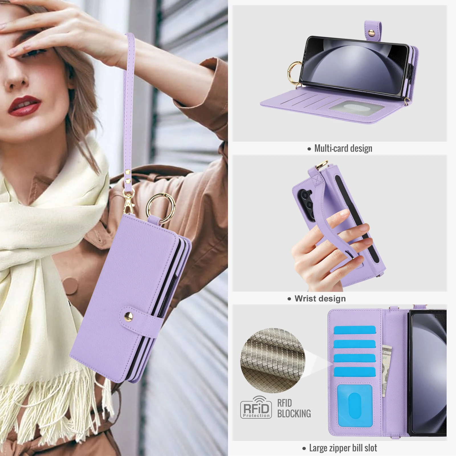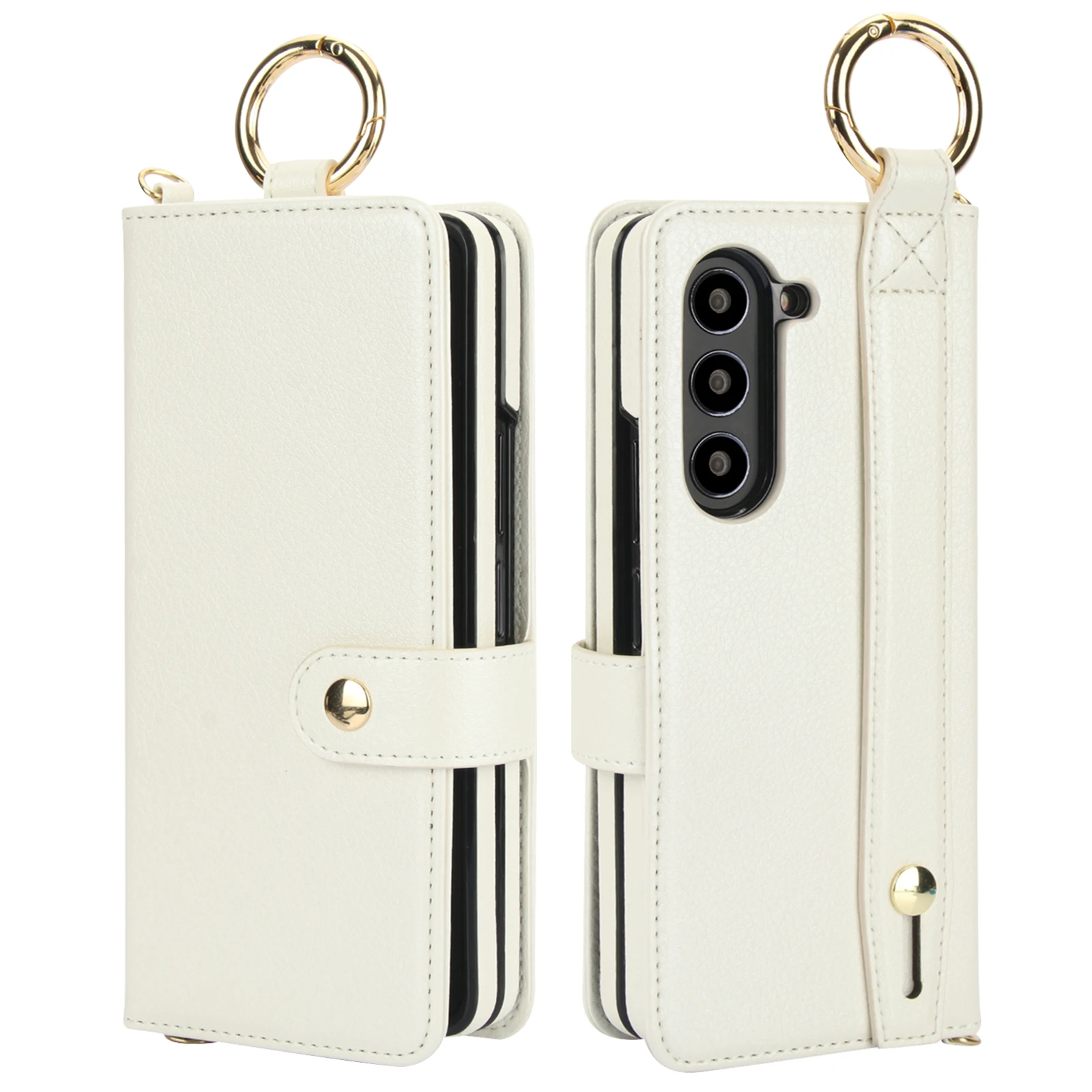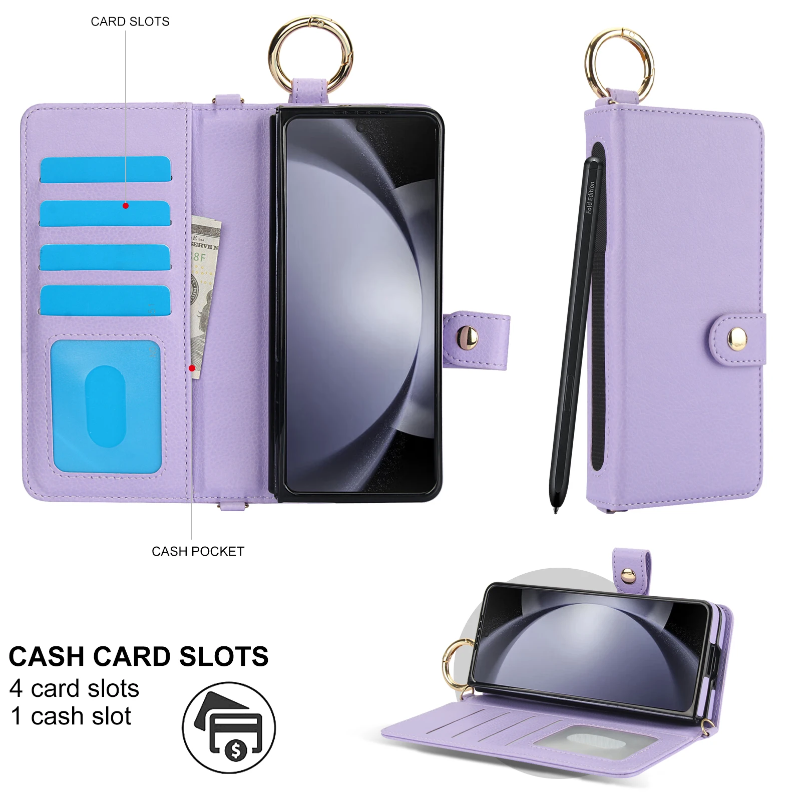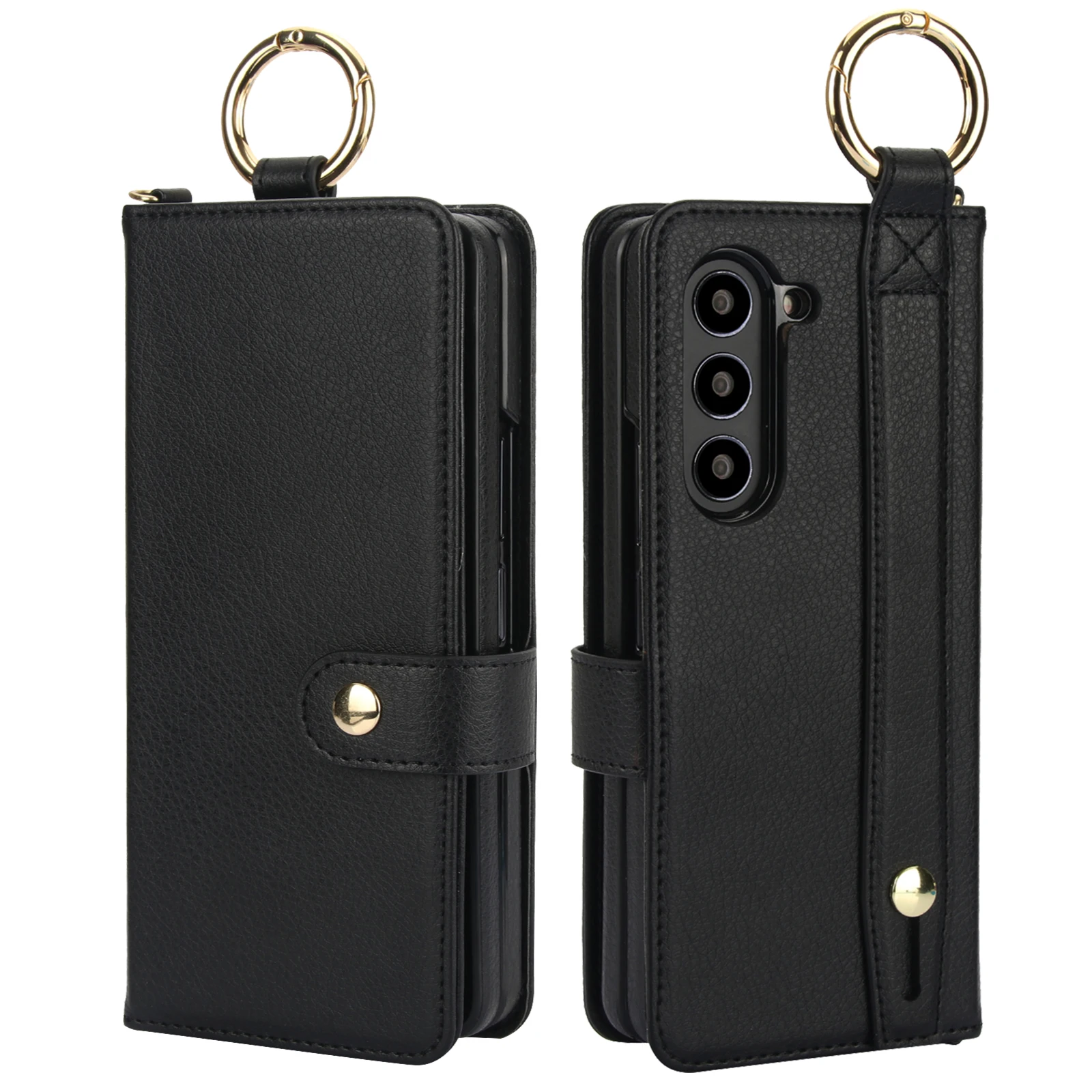 Para Samsung Galaxy Z Fold 7 6 5 4 3 5G cordón cruzado Funda de cuero tipo billetera para tarjetas cuerda para la muñeca funda con soporte abatible con ranura para bolígrafo