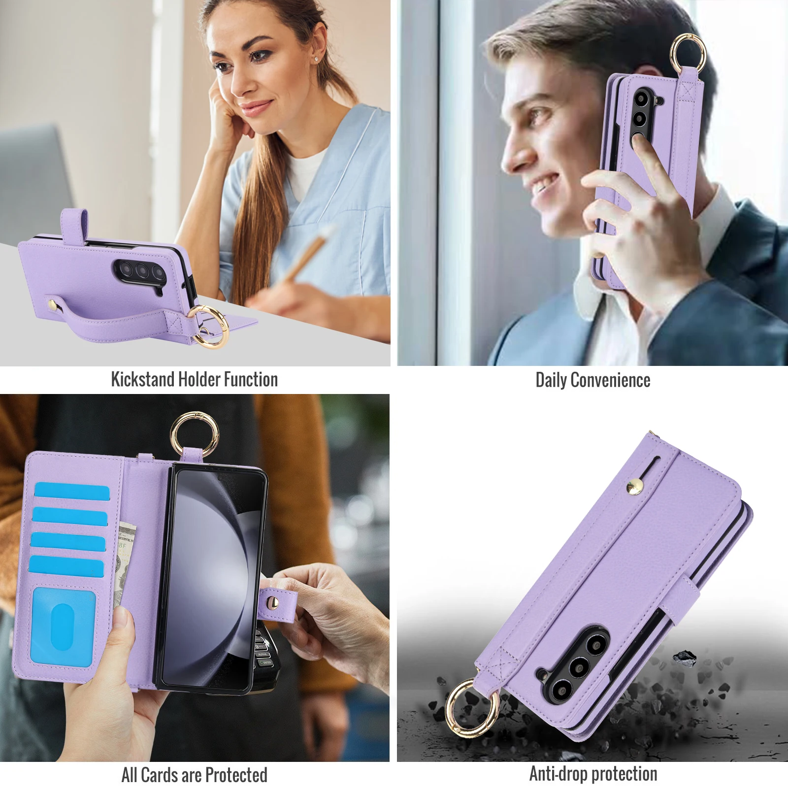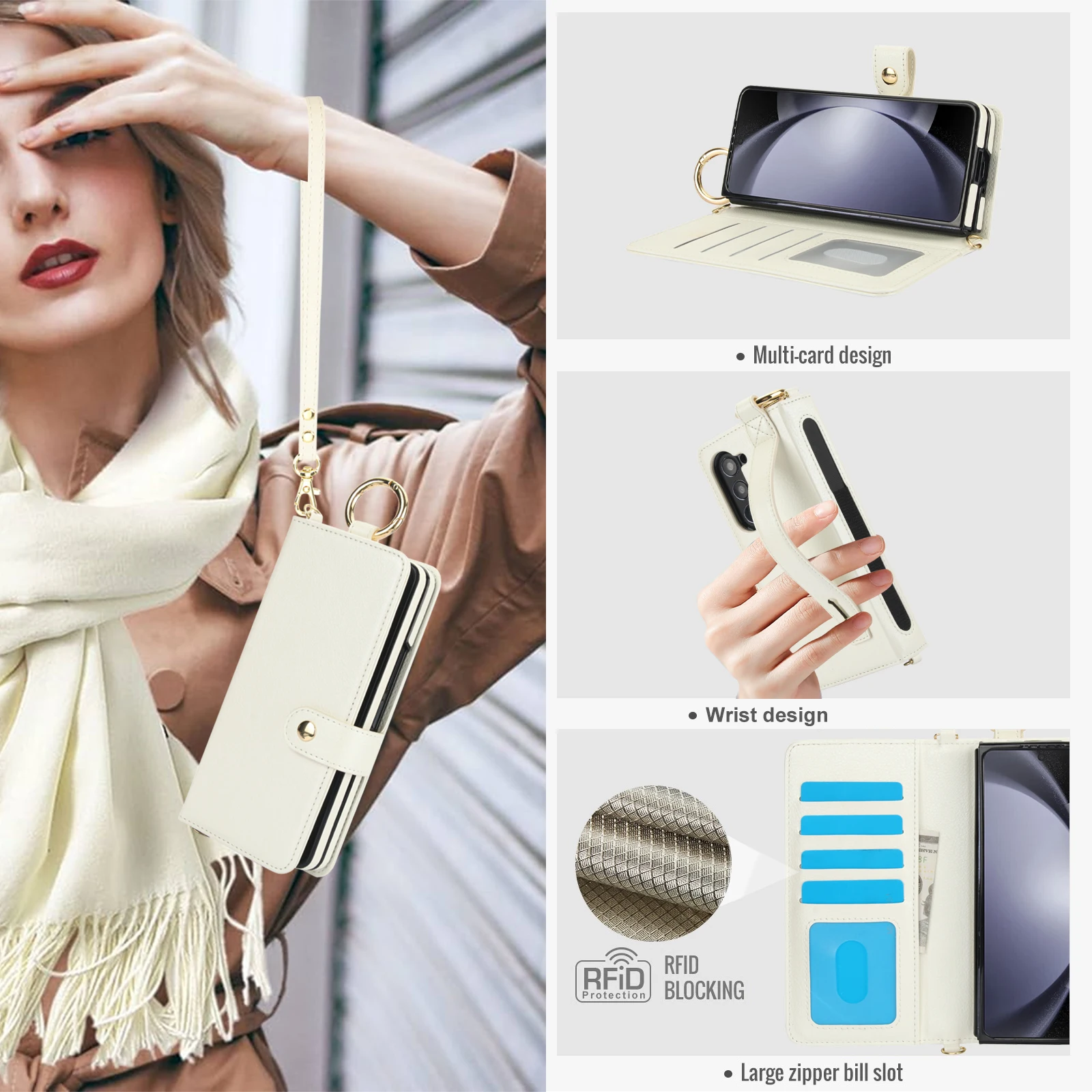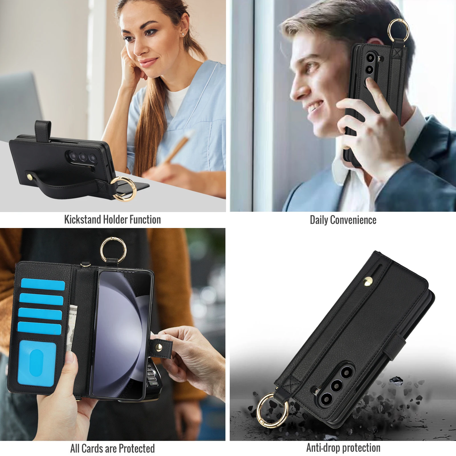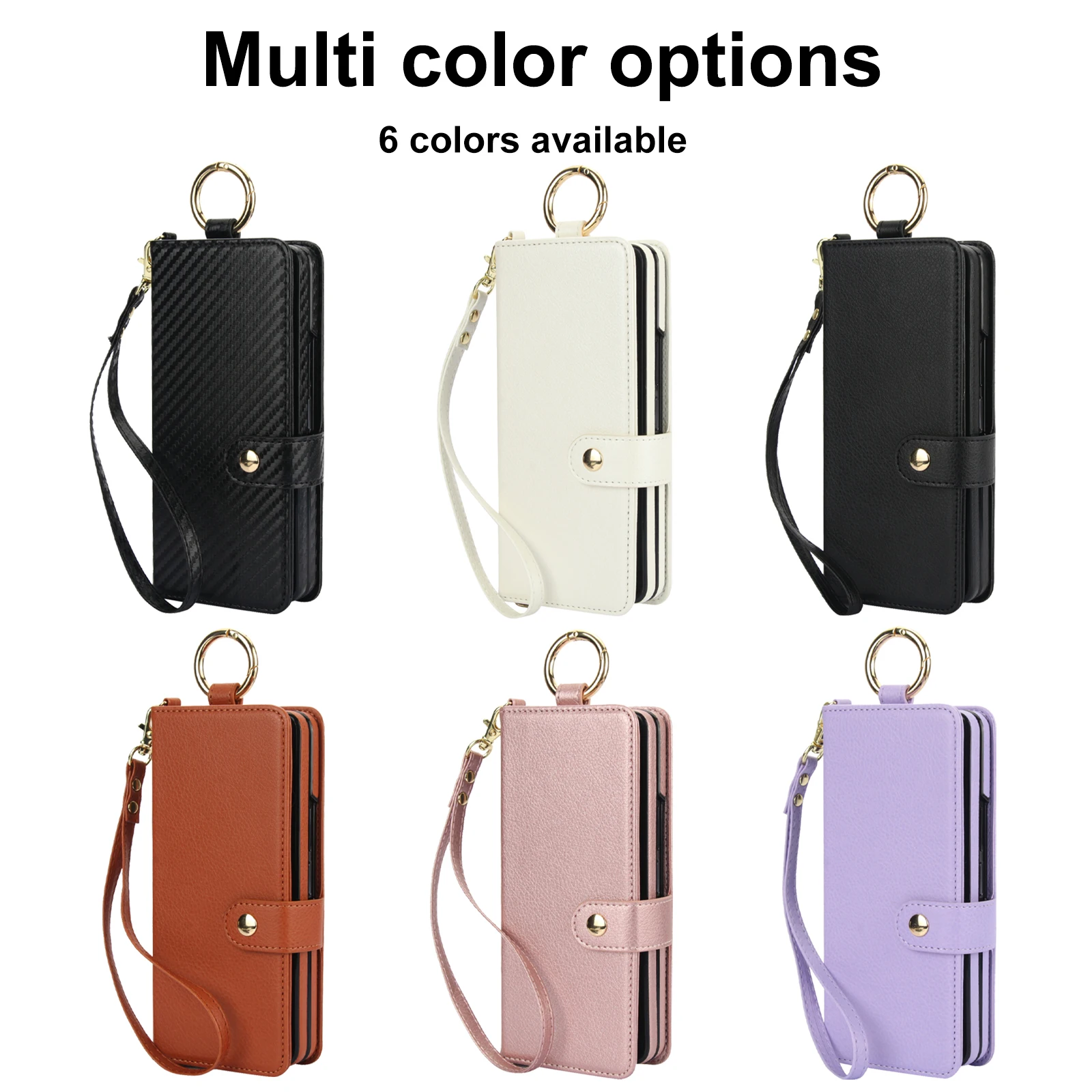 Para Samsung Galaxy Z Fold 7 6 5 4 3 5G cordón cruzado Funda de cuero tipo billetera para tarjetas cuerda para la muñeca funda con soporte abatible con ranura para bolígrafo