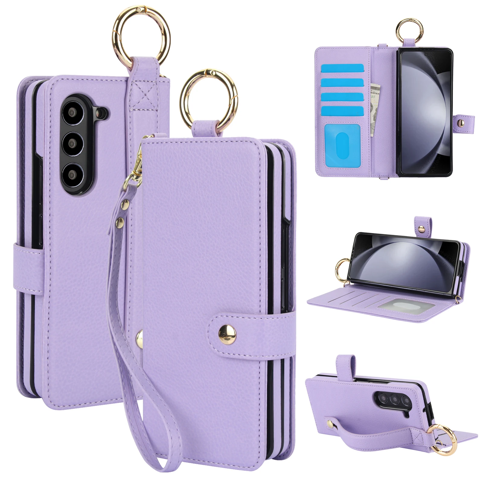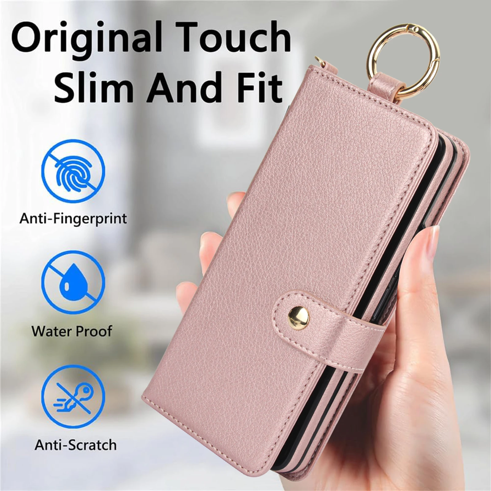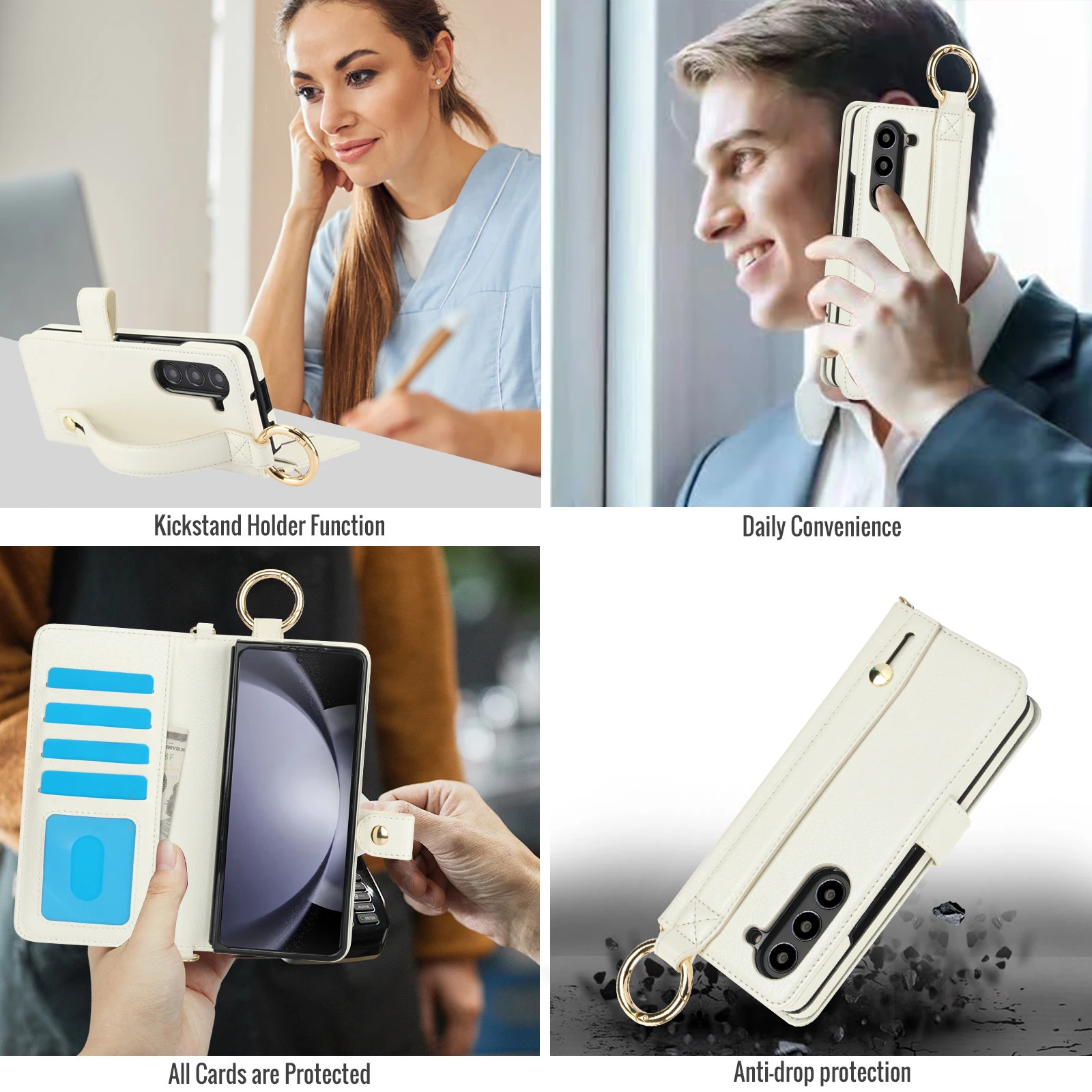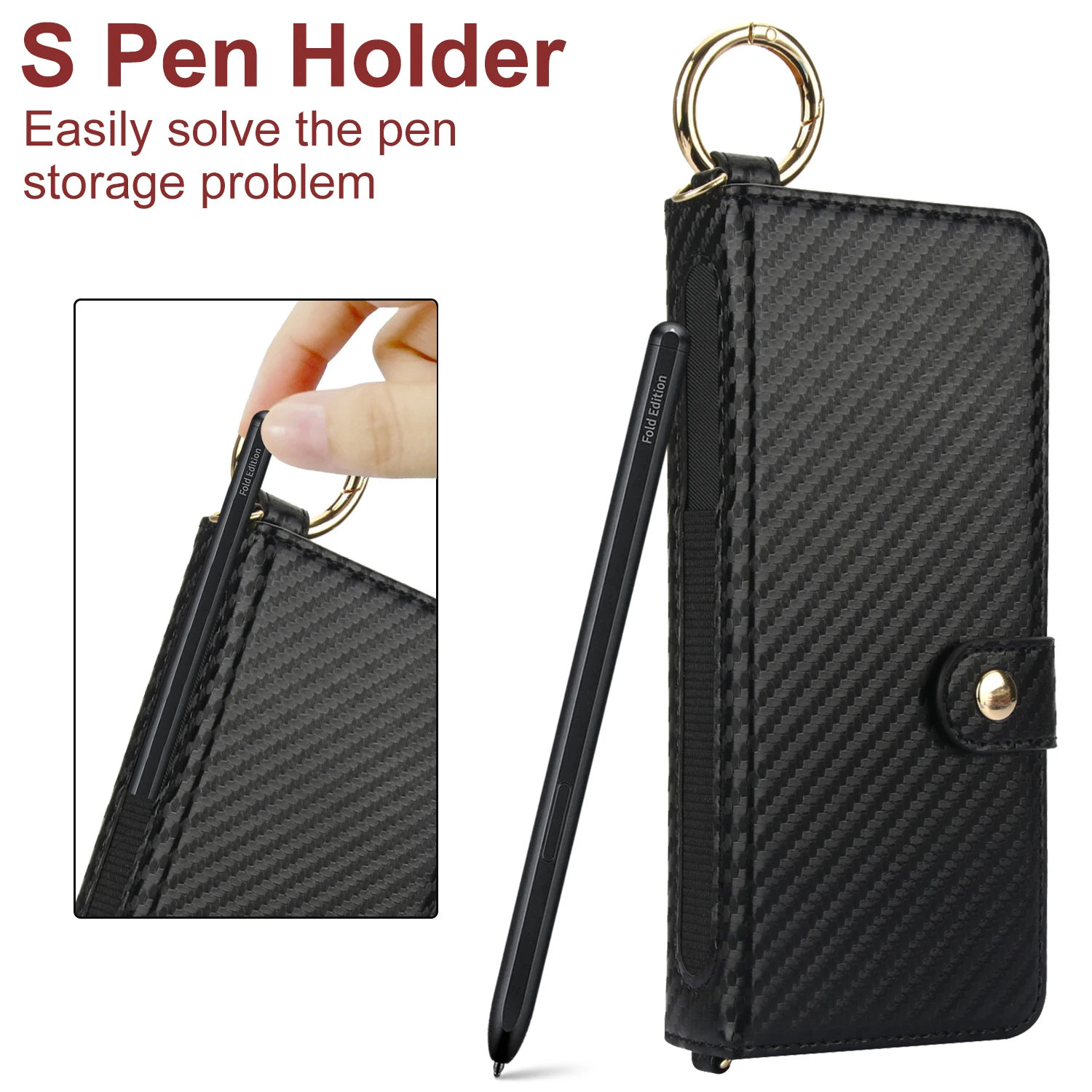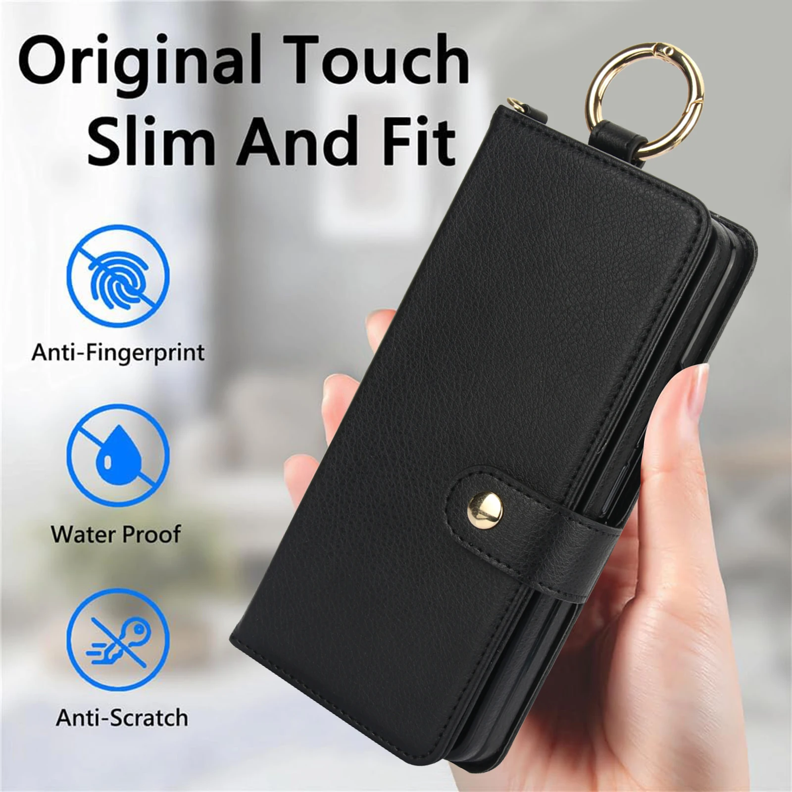 Para Samsung Galaxy Z Fold 7 6 5 4 3 5G cordón cruzado Funda de cuero tipo billetera para tarjetas cuerda para la muñeca funda con soporte abatible con ranura para bolígrafo