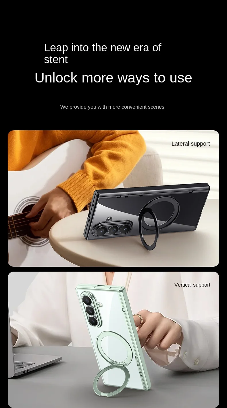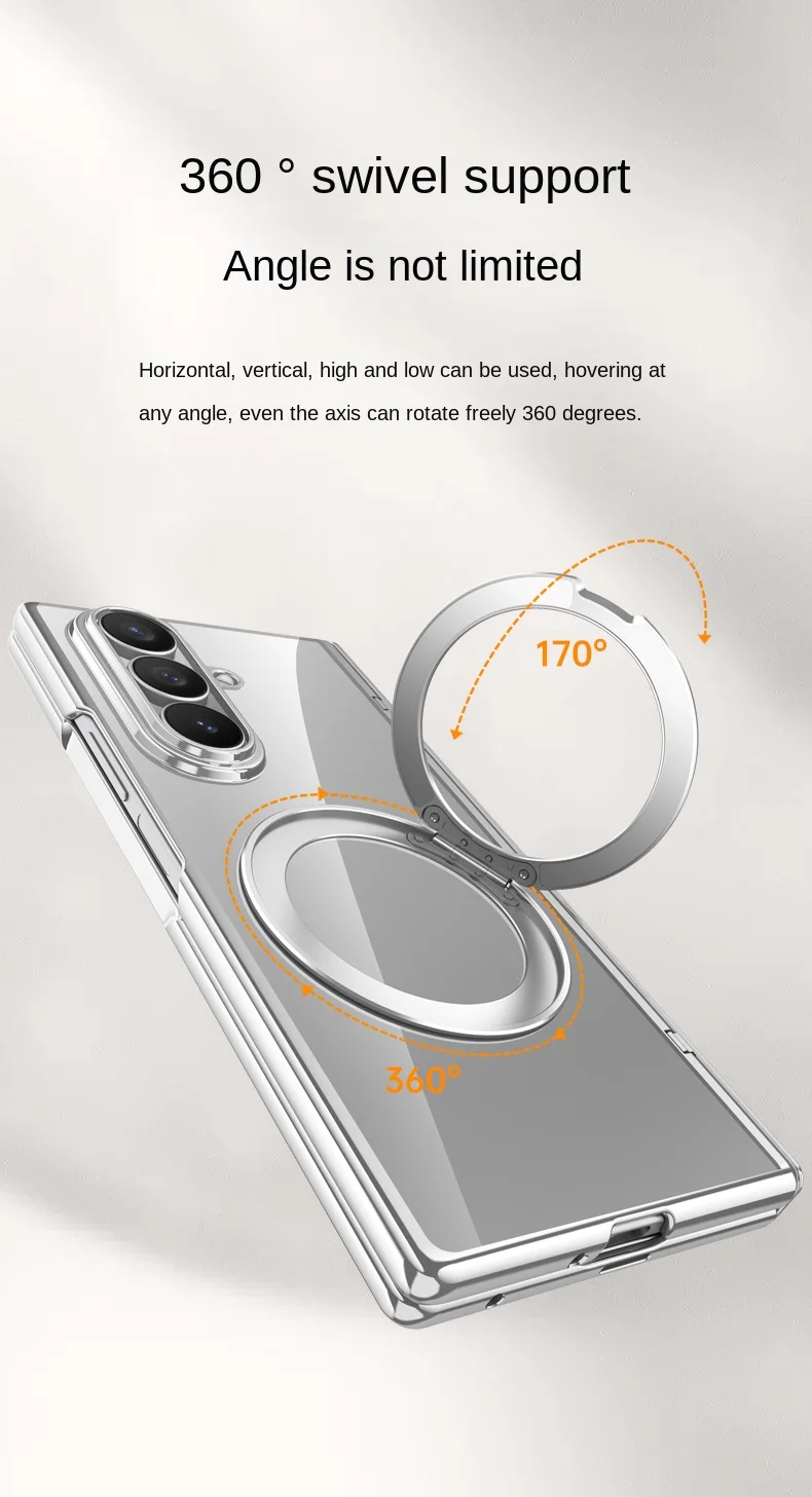 Caja metálica súper bonita. Bien acabado y brillante. Ajuste cómodamente en el pliegue7. Superficies transparentes de plástico. La funda es tan lisa que el teléfono se siente endeble al usarlo, da la impresión de que se puede deslizar fácilmente. Empuñaduras de silicona instaladas para fijar. La cubierta frontal de plástico se raya con facilidad. Ya retirado para instalar panel de vidrio. El soporte para anillos funciona. Gira 360. Buen caso en general
