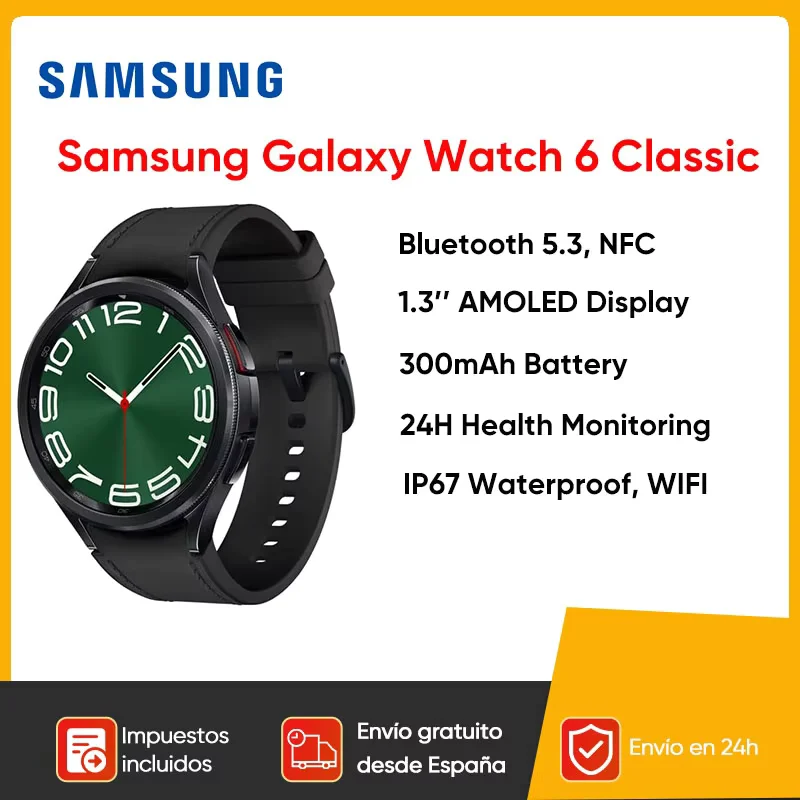 Comprar Samsung-reloj inteligente Galaxy 6, dispositivo clásico con Bluetooth, Pantalla AMOLED de 43mm y 1,3 pulgadas, batería de 300mAh, NFC, Wifi, GPS, resistente al agua IP68
