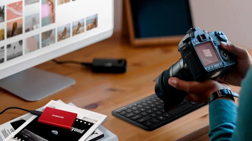 El SSD portátil ligero y de bolsillo T7 ofrece velocidades rápidas con almacenamiento de datos fácil y confiable para transferir archivos grandes. Ya estés almacenando documentos comerciales, juegos o películas decisivos, el SSD portátil T7 te ofrece velocidad y durabilidad en un paquete de tamaño de una palma. Presentamos el nuevo estándar en almacenamiento externo, disponible en tres capacidades para adaptarse a sus necesidades: 500GB, 1TB o 2TB.