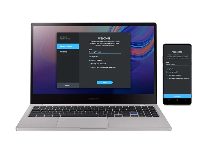 El T7 viene integrado con software para ayudarte a configurar una contraseña y obtener las últimas actualizaciones de firmware para tu PC, Mac o dispositivos móviles Android. También puede descargar la aplicación móvil para teléfonos inteligentes y tabletas Android.