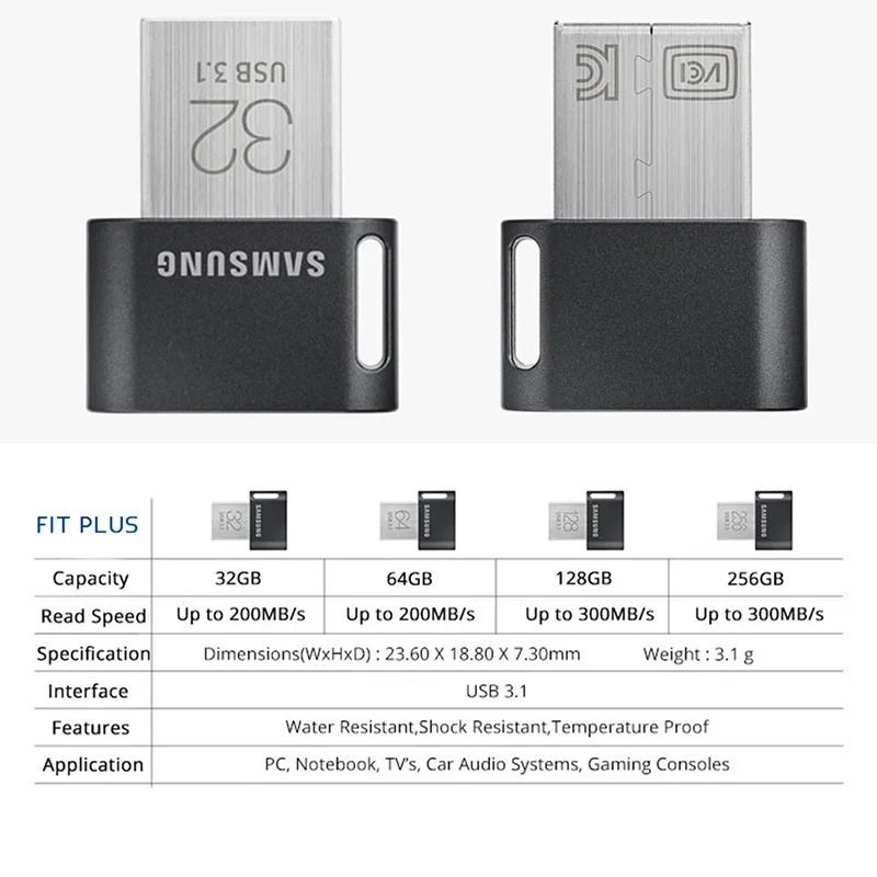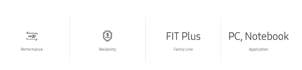 Los archivos se mantienen seguros en cualquier lugar. El líder de Samsung en memoria flash hace del FIT Plus una unidad confiable para almacenar sus valiosos datos. Funciona a través de todo con un impermeable 1 1;, a prueba de golpes ⊃ 2;, a prueba de temperatura ⊃ 3;, a prueba de imán ⁴ y a prueba de rayos X ⁵ cuerpo,. Todo respaldado por una garantía limitada de 5 años ⁶