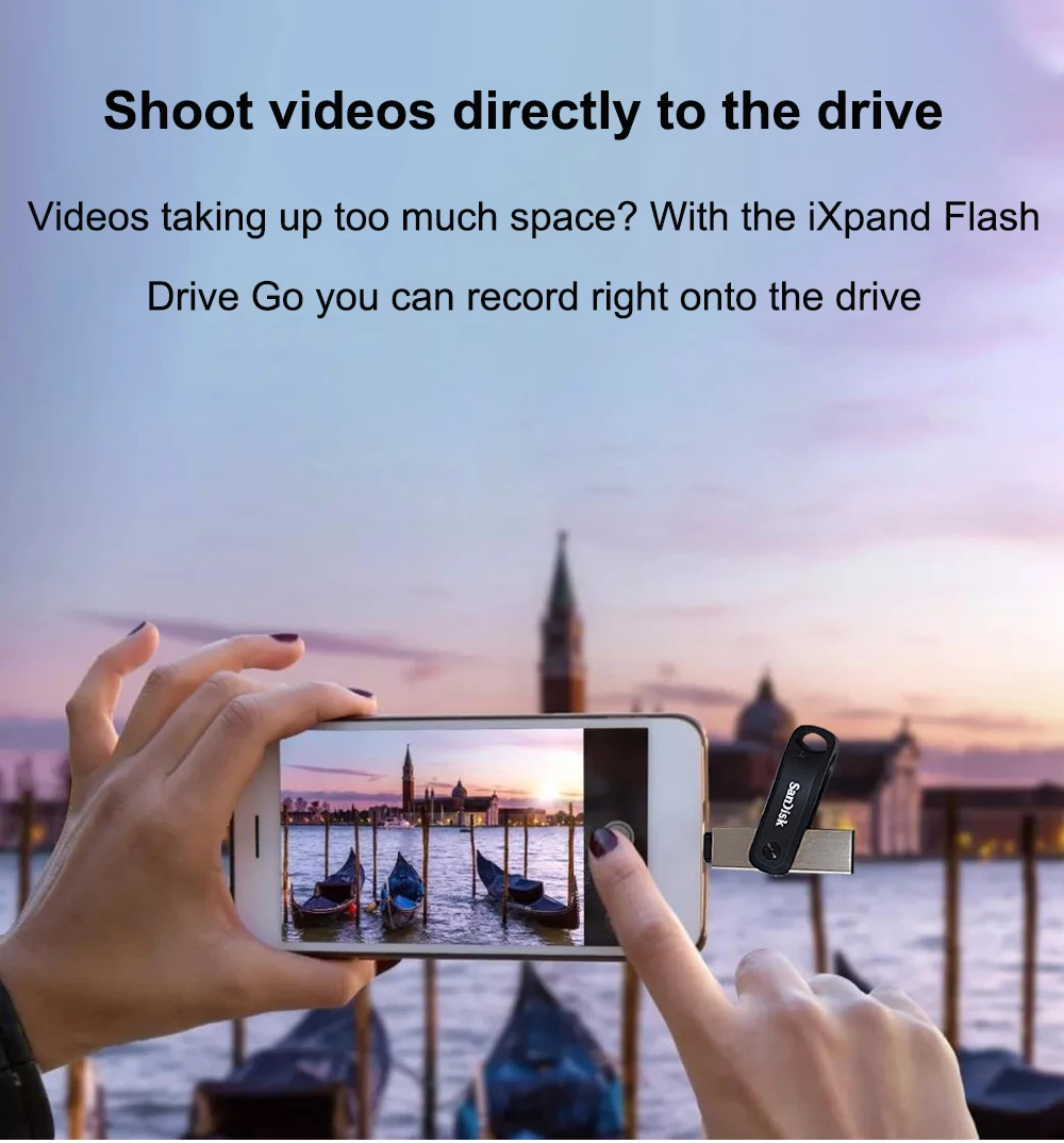 Videos taking up too much space? With the iXpand™ Flash Drive Go you can record right onto the drive, keeping those memory-heavy files from taking up valuable space on your iPhone