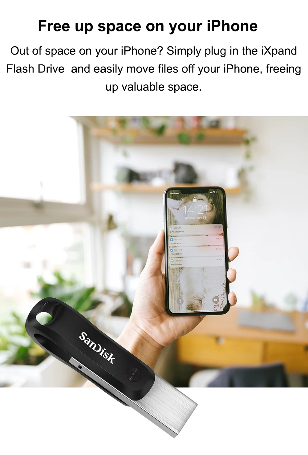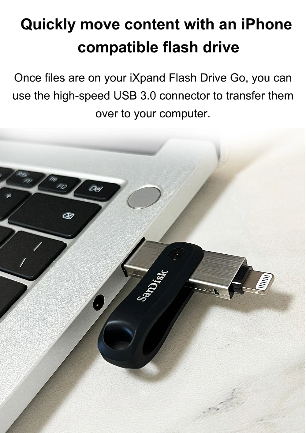 The iXpand™ Flash Drive Go has a swivel design that protects its connectors when it’s tossed in your bag or pocket and a keyring hole makes it easy to attach to your keyring. So it’s always handy if you need to free up space when you’re out and about.