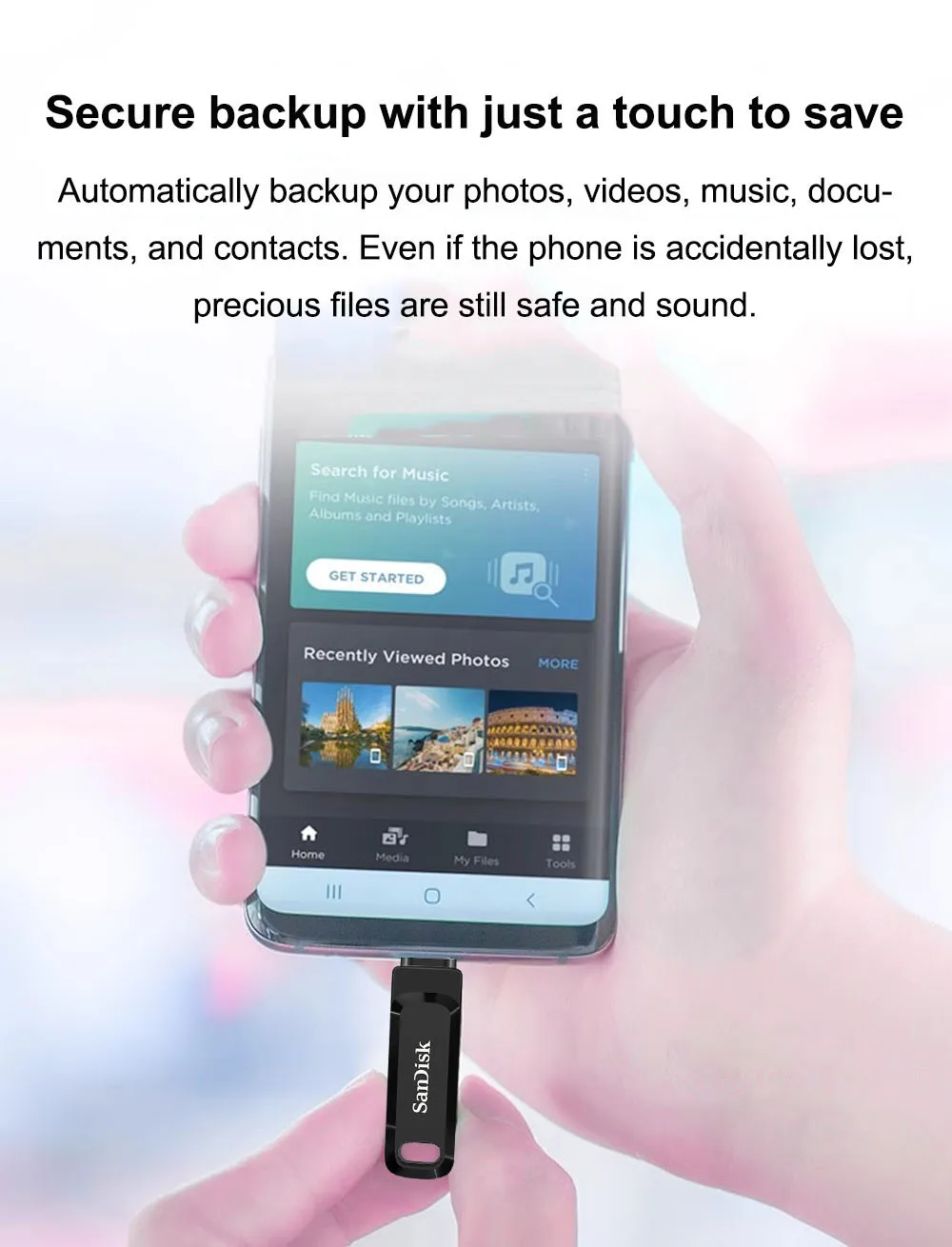 2. La copia de seguridad automática es solo un complemento. Haga una copia de seguridad automática de sus fotos, videos, música, documentos y contactos más recientes con la aplicación SanDisk Memory Zone. Tenga la seguridad de que incluso si alguna vez pierde su teléfono inteligente, tiene los recuerdos que más importa.