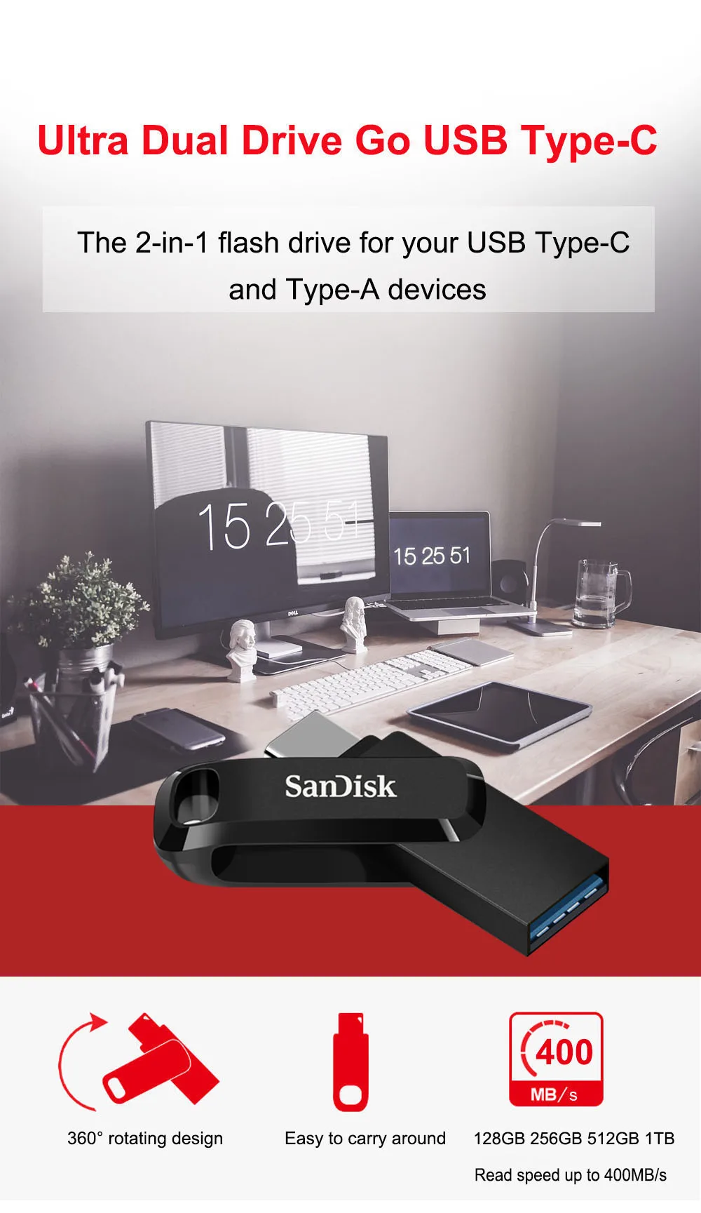 usb SanDisk con conector USB A y C, 64GB de almacenamiento