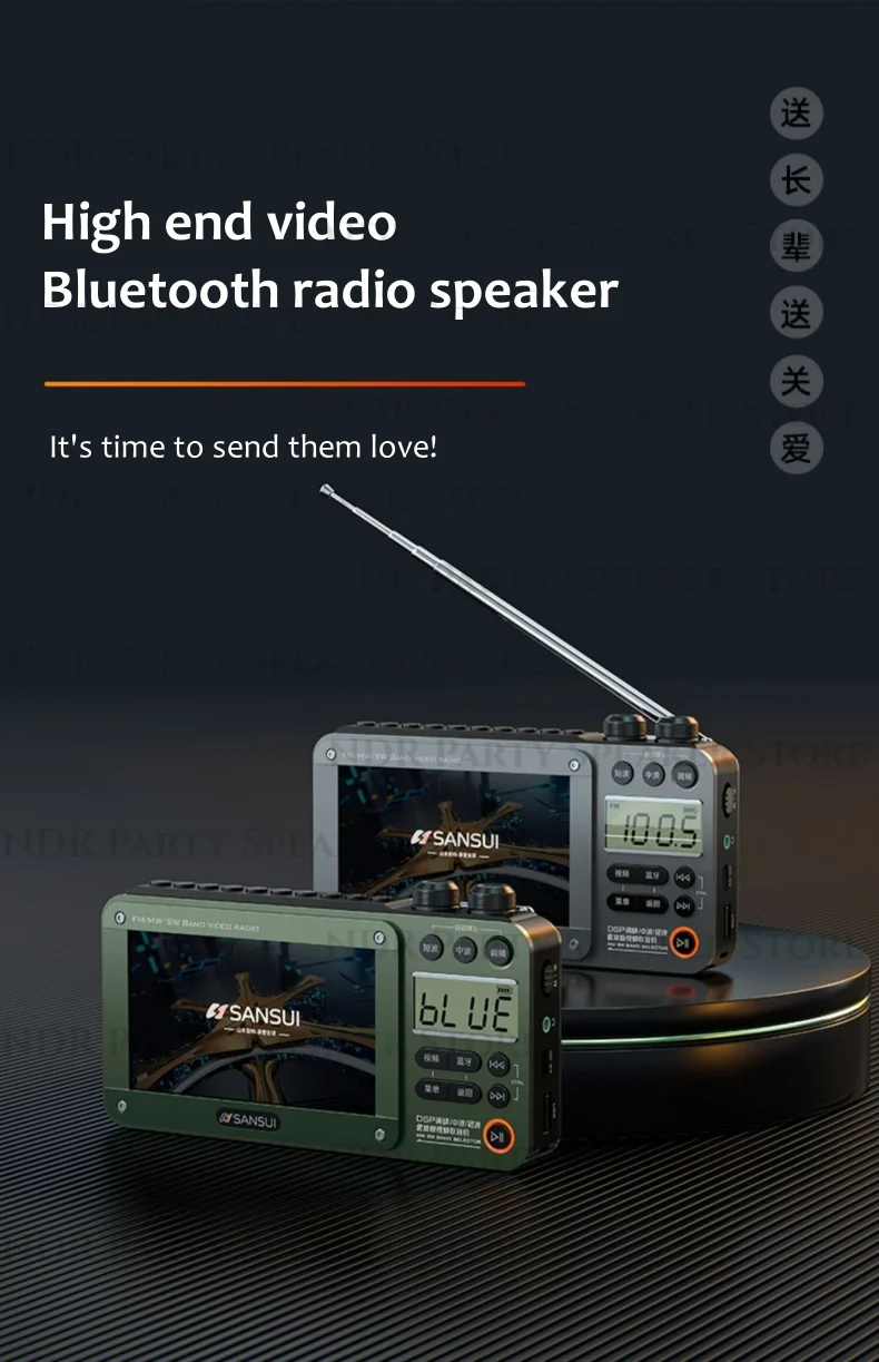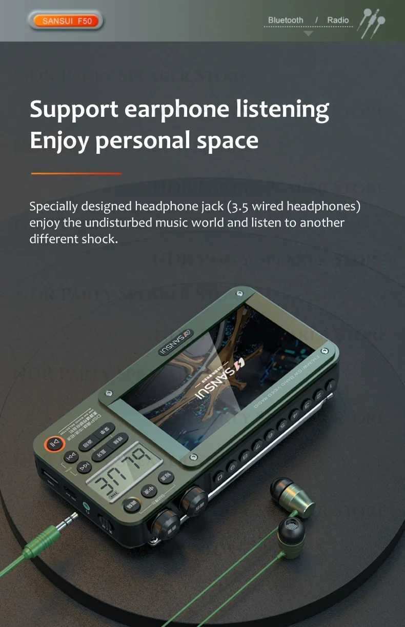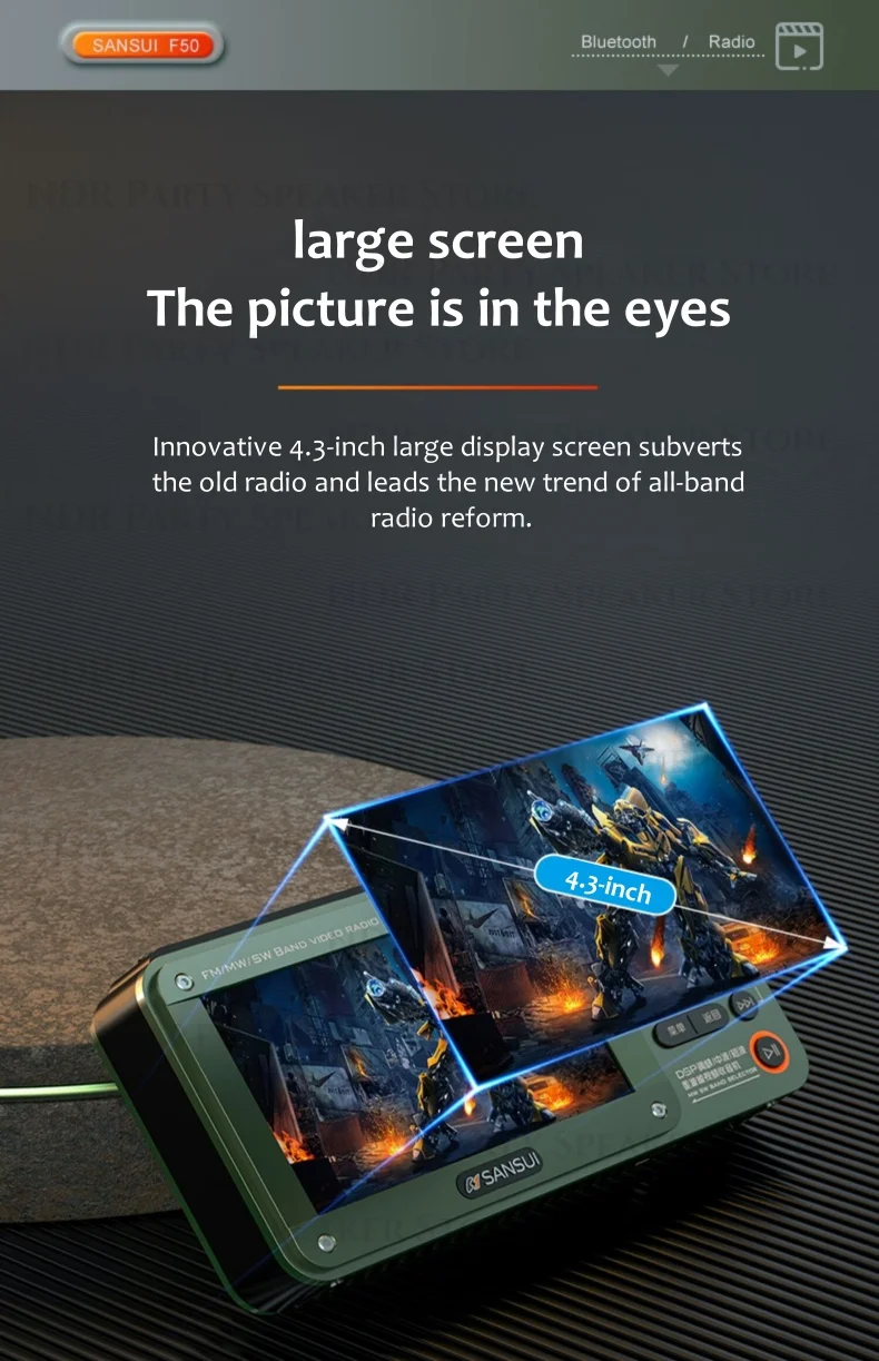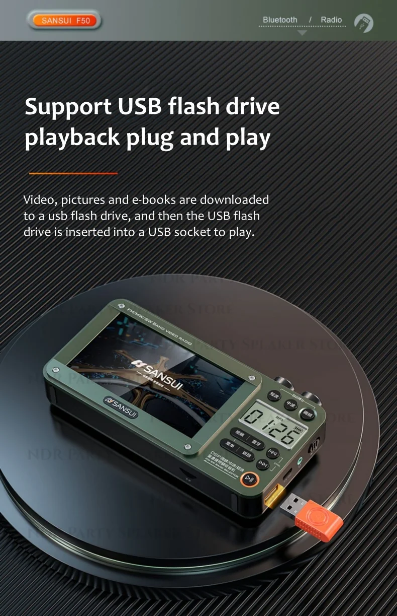 Comprar SANSUI-REPRODUCTOR DE vídeo y música F50 para exteriores, Radio FM/MW/SW HD de 4,3 pulgadas, tarjeta enchufable, altavoces inalámbricos portátiles recargables con Bluetooth