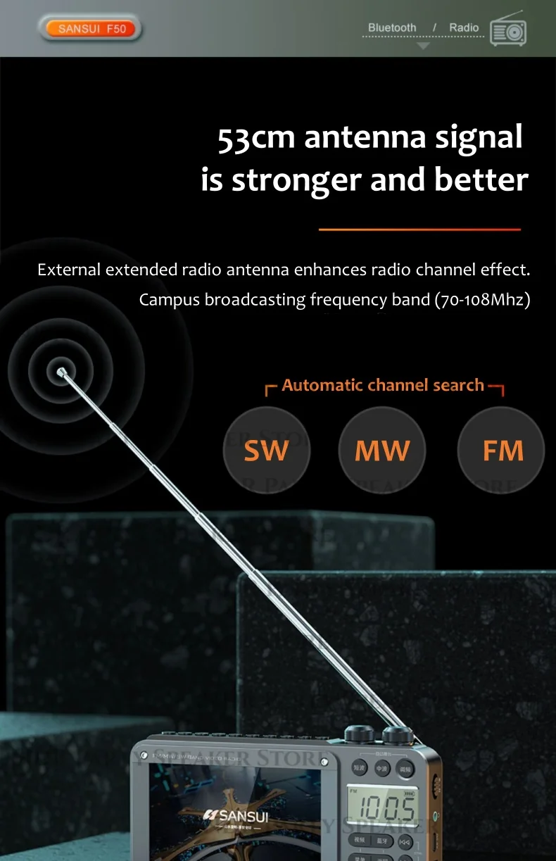 2. Antena de 53cm con palanca giratoria de 360 grados, Radio FM, MW, SW de alta sensibilidad de todas las bandas, radio automática, Radio FM compatible con la transmisión del campus.