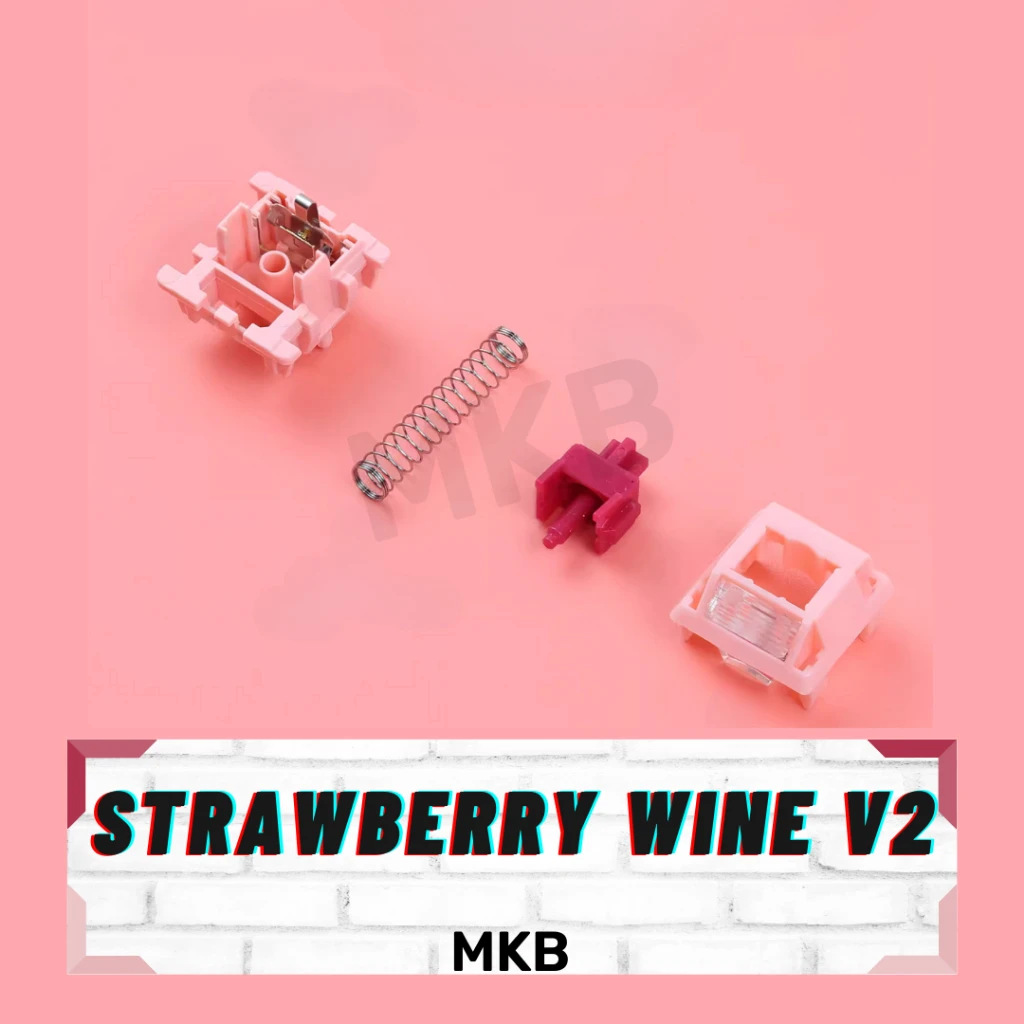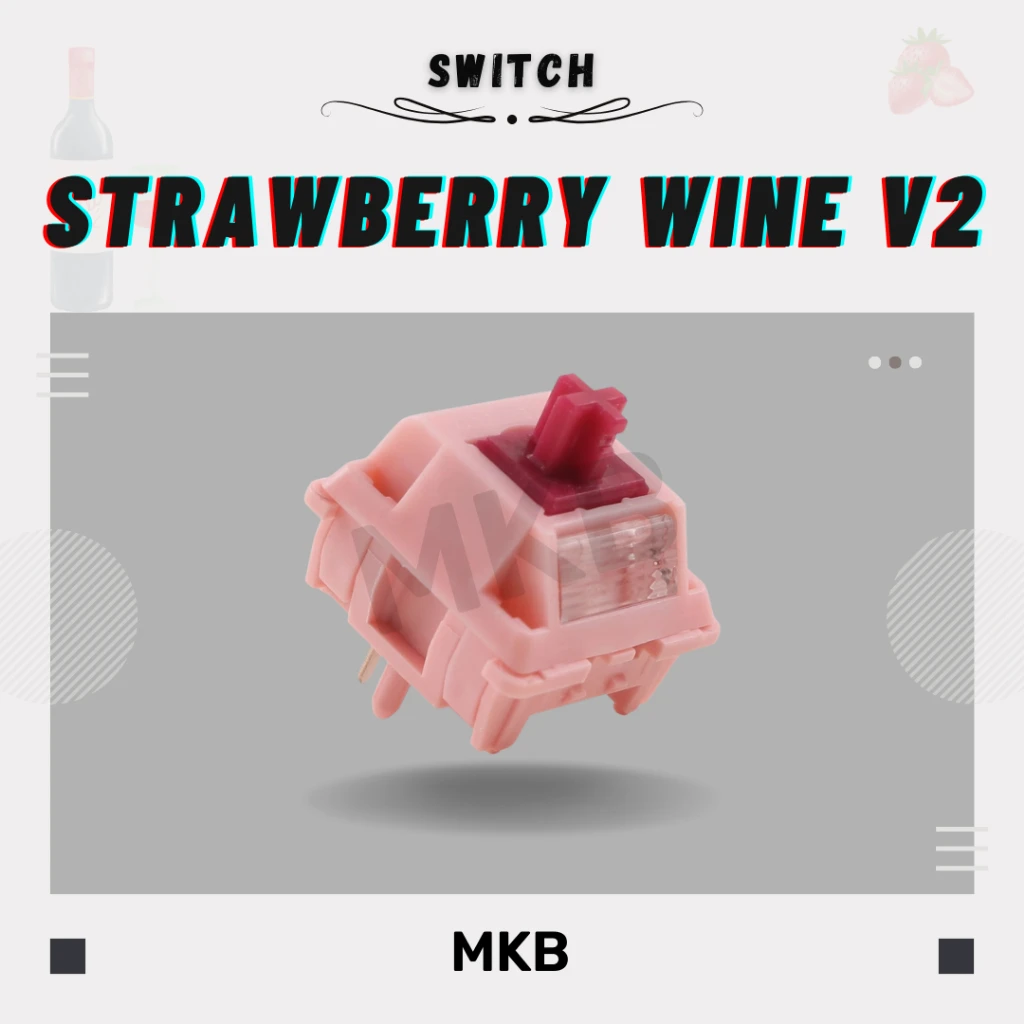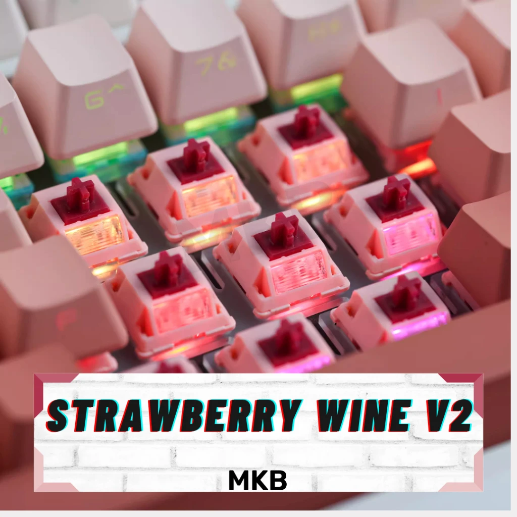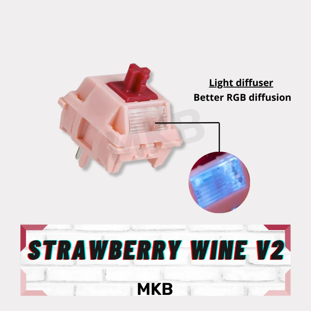 En comparación con la versión anterior Strawberry Wine V1, se ha añadido un difusor de luz, así como una hoja de contacto de níquel mejorada. Con diferentes materiales, desde el vástago Y3 para un mejor sonido y una sensación de fondo hacia fuera en la carcasa inferior PA12, que es la misma que la de los interruptores Sarokeys BCP.