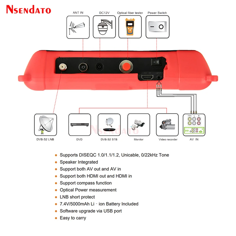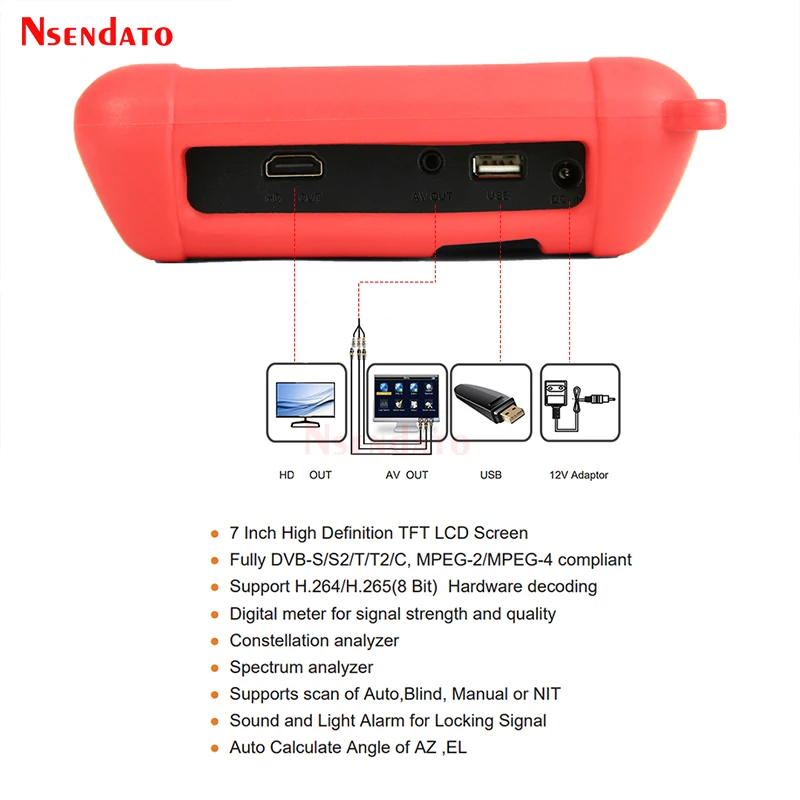 Característica:Pantalla LCD TFT de alta definición de 7 pulgadasTotalmente compatible con los modelos 2/S2/T/T2/C y con los modelos 2/2/C/2/2/C/2/2/C/2/2/C/2/2/C/2/2/2/C/2/2/2/CAdmite decodificación de hardware H.264/H.265(8 bits)Medidor digital para intensidad y calidad de señalAnalizador de constelacionesAnalizador de espectroAdmite escaneo automático, ciego, manual o NITAlarma de sonido y luz para señal de bloqueoCalcular automáticamente el ángulo de AZ ,ELAdmite DISEQC 1,0/1,1/1,2, Unicable, tono 0/22kHzAltavoz integradoAdmite salida y entrada AVAdmite salida HDMI y entrada HDMIAdmite Función de brújulaMedición de potencia ópticaProtección corta LNBBatería de iones de litio de 7,4 V/5000mAh incluidaActualización de software a través del puerto USBFácil de llevarESTÁNDARES DE TRANSMISIÓN:/S, DVBT/T2, 1, 2, 2, 3, 3, 3, H.264/H.265(8 bits)ENTRADA/DEMODULACIÓN SATÉLITETipo de conector: tipo FFrecuencia de entrada: 950 a 2150 MHzNivel de entrada de señal:- 65 A-25 dBmControl de interruptor de banda: 22KHzSuministro LNB: 13V/18V, IMax 350mATipo de desmodulación: QPSK,8PSK,16APSK,32APSKTasa de símbolos: 2 Rs 45 Mbanda (SCPC/MCPC)DVB-T/T2/C ENTRADA/DEMODULACIÓN:Tipo de conector: tipo hembraFrecuencia de entrada: 48 a 862 MHzNivel de entrada de señal:-79.5dBm (MAX)Suministro ANT: 5V, 12V/24V Imax 100mATipo de desmodulación: QPSK,16QAM.64QAM,256QAMCARACTERÍSTICA LCDTipo LCD: TFT transmisivoNúmero de puntos: 800x3(RGB) x 480Interfaz de salida/entrada AVTipo de conector: Conector de 3,5mmEntrada/salida de vídeo: CVBSEntrada/salida de audio estéreo salida L/RPROCESAMIENTO DE AUDIO/VIDEODescompresión de vídeo: 1/2 MP @ HL, decodificación de vídeo, resolución HD MPEG-4 ASP @ L5, H.264/H.265 MP y HP @ L4, decodificación HW JPEGTasa de resolución: Marco PAL-25 @ 720*576, marco de 720*480 A *Compatibilidad de señal: admite conversión para diferentes formatos de vídeoFormato de vídeo: 4:3,16:9, por Pan & Scan y conversión de buzónDescompresión de audio: capa I/II, 1: 2Modo de salida de audio: estéreo, mono, R/LSuministro eléctricoBatería de iones de litio 7,4 V/ 000mAh (prevalecerá la máquina detrás del etiquetado)Salida del adaptador: DC12V/1.5A, INTUPT:100 ~ 240VAC 50/60Hz(WillEstar sujeto a la configuración real)Paquete:Medidor satélite digitalManual del usuarioCable AVCable cargador de cocheAdaptador de corrienteLínea de conexión DC 12V
