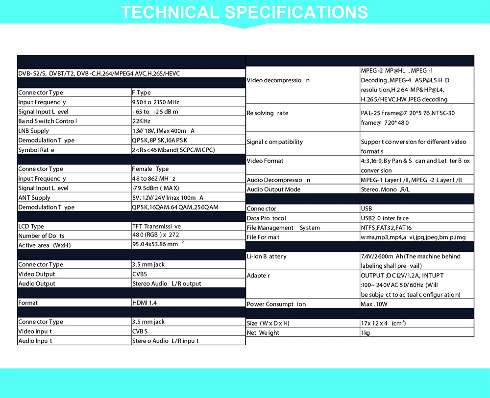 Satlink-Combo de DVB-T/T2, con soporte H.265 HEVC, de 2, 2, 2, 2, 2, 2, 2, 2, 2, 1, 2, 2, 2, 2, 2, 2, 2, 2, 1, 2, 2, 2, 2, 2(8 bits)H.265/QPSK 8PSK 16APSK con pantalla TFT de 4,3 pulgadas/pulgadas