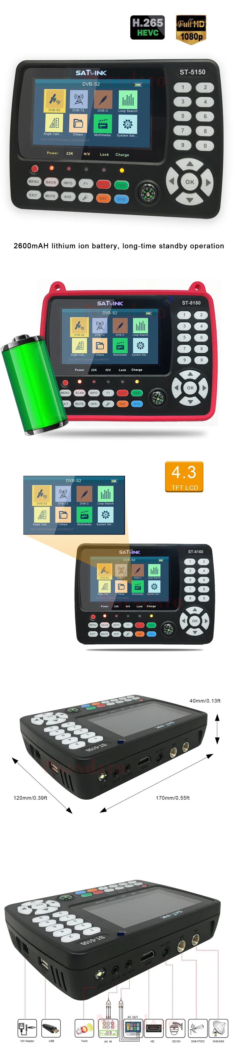Comprar Satlink-Medidor de señal satelital ST-5150/T2/C COMBO, buscador de satélite, pantalla de 4,3 ", H.265, MPEG4, QPSK 8PSK 16, APSK