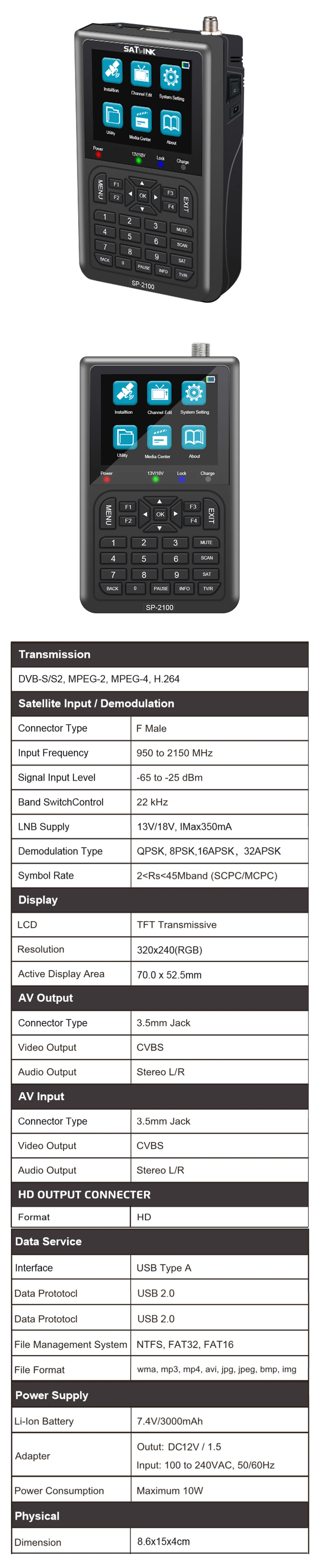 Comprar SATLINK SP2100 SP-2100 Buscador de satélite DVB-S DVB-S2 Buscador de satélite Pantalla LCD de 3,5 pulgadas MPEG-2/4 Medidor buscador de satélite de señal digital