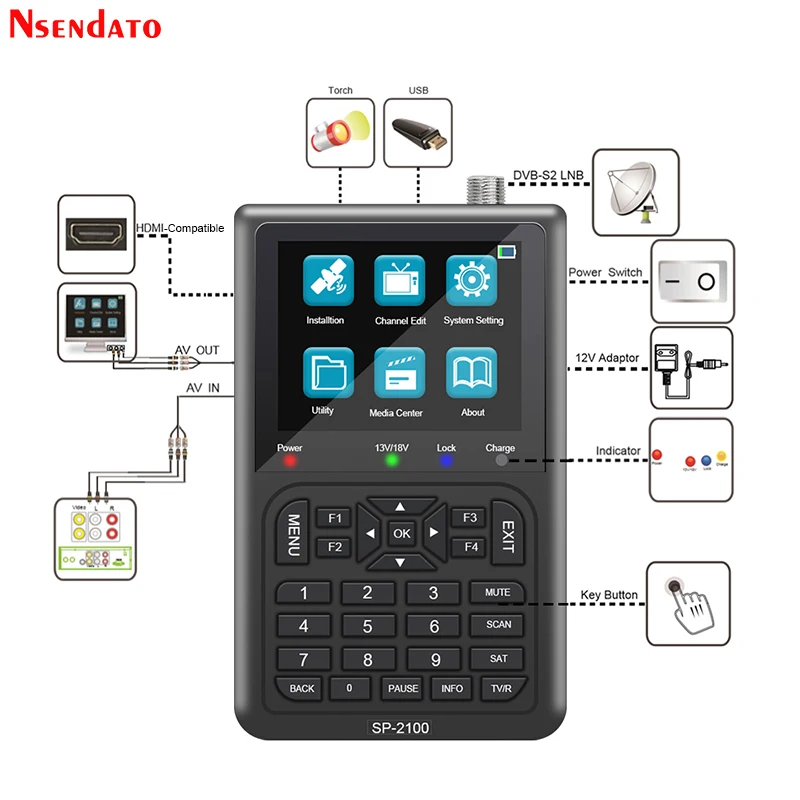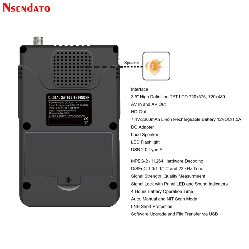 Descripción:SP-2100 es un medidor de satélite portátil compatible con DVB-S/S2 y MPEG-2/4 H.264.Con su tamaño compacto, peso liviano, interfaz de usuario intuitiva, largas horas de funcionamiento de la batería y un rico conjunto de funciones, el medidor proporciona todas las funciones necesarias para la instalación y verificación del servicio de televisión digital por satélite a hogares residenciales o unidades de vivienda múltiple.Características:MPEG-2 / H.264 Decodificación de hardwareCálculo automático del ángulo de AZ, ELDiSEqC 1,0/1.1/1,2 y 22 kHz TonoMedición de intensidad y calidad de la señal4 horas de funcionamiento de la bateríaModo de escaneo automático, ciego, manual y NITProtección contra cortocircuitos LNBActualización de software y transferencia de archivos vía USBInterfaz:Pantalla LCD TFT de alta definición de 3,5 pulgadas 720x576, 720x480Entrada AV y salida AVSalida HDBatería recargable de iones de litio de 7,4 V/2600 mAh
