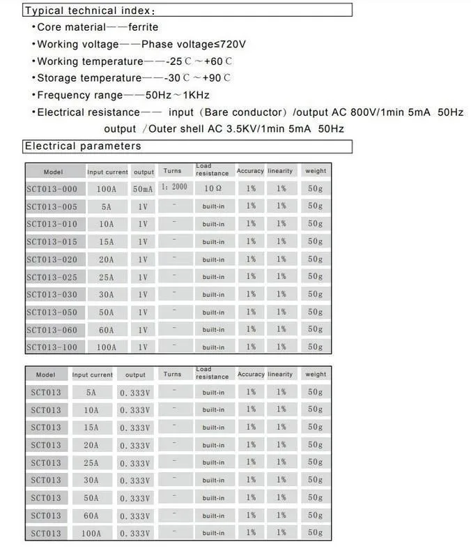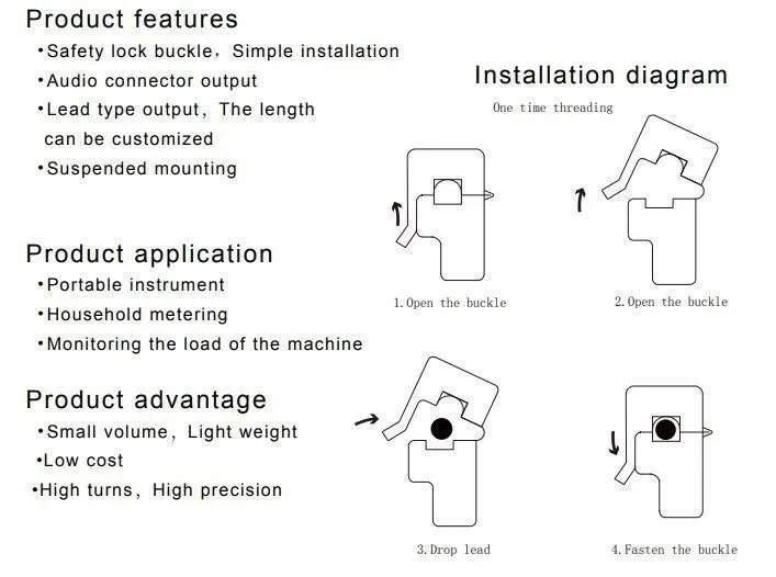 Current measurement for AC motors, lighting equipment , air compressor , monitoring and protection. Core material : ferrite mechanical strength : opening and closing times of not less than 1000 times (20 °c test )